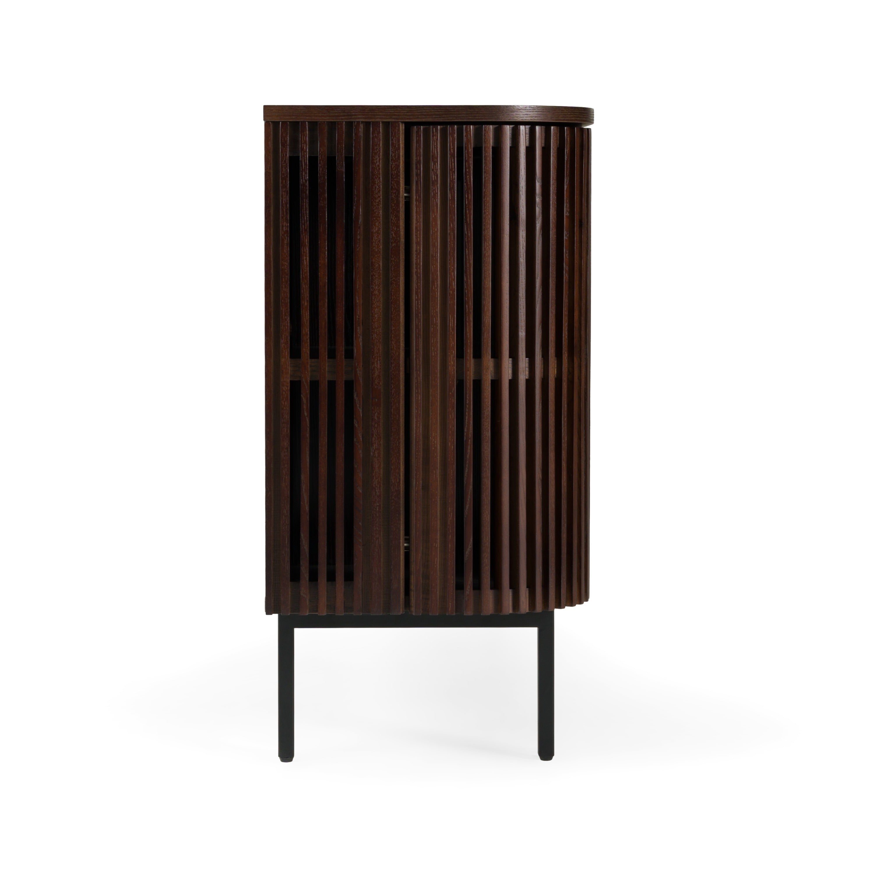 The Modrest Clifton Modern Smoked Ash Buffet is a stunning fusion of artistry and functionality, designed to elevate any sophisticated interior. Its rich smoked ash finish and slatted door design exude a refined, modern elegance, while the sleek black iron legs add a touch of industrial chic. Behind its clean lines and four doors lies ample storage, seamlessly blending practicality with style. Perfect as a dining room centerpiece or a statement piece in the living room, the Clifton Buffet brings an air of timeless luxury and meticulous craftsmanship to your home, making every detail of your space feel intentional and elevated.
