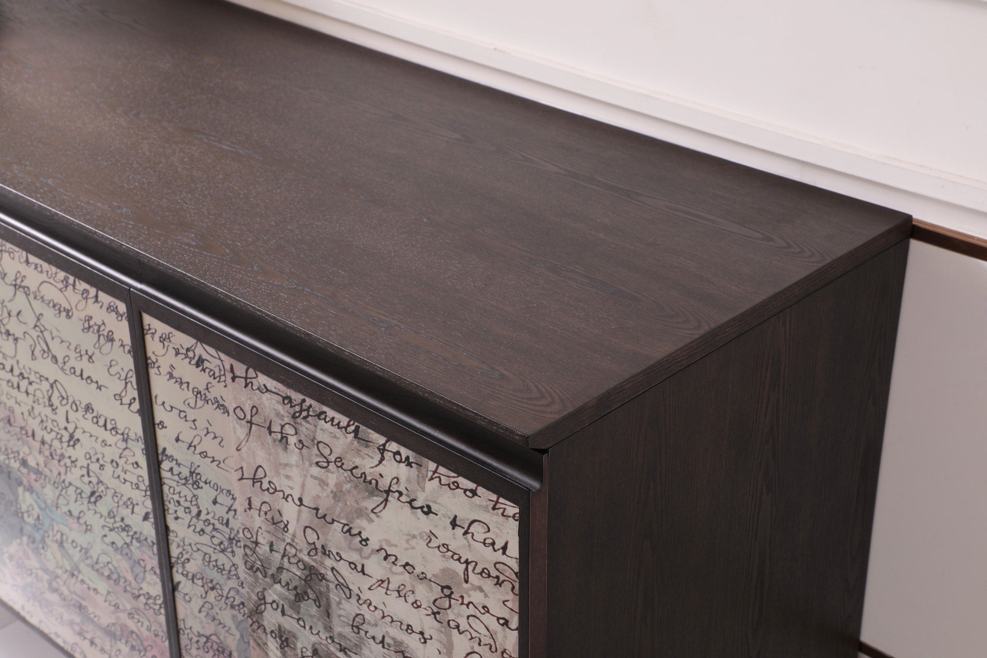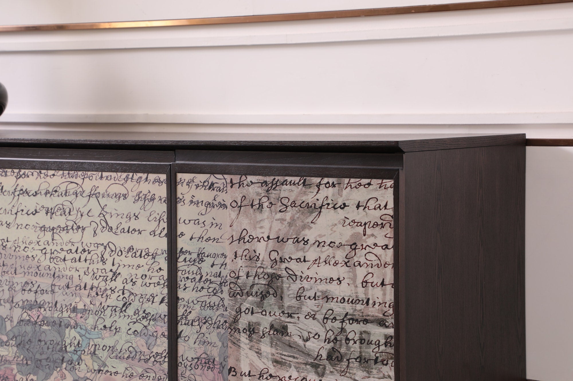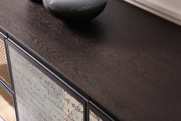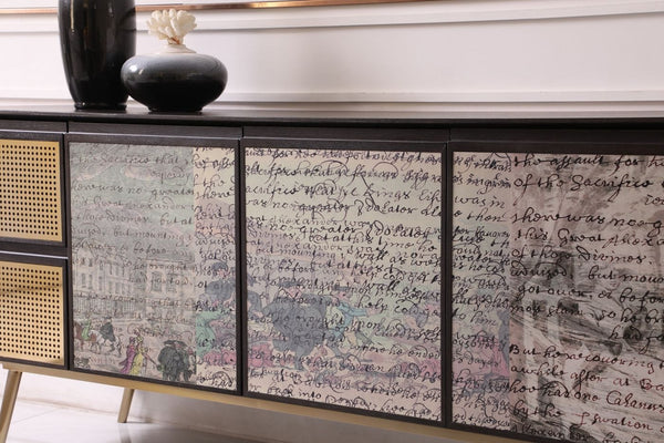 The Phelan Buffet is a modern bohemian style buffet with engaging finishes. The two soft closing drawers are adorned with a gold cane look gold panel inset into its face that adds a glamorous touch to this exciting piece. The three cabinet doors are faced with a multicolored art piece, inspired by a handwritten letter. A gold base with tapered legs and a smoked ash surround finishes this unique piece.