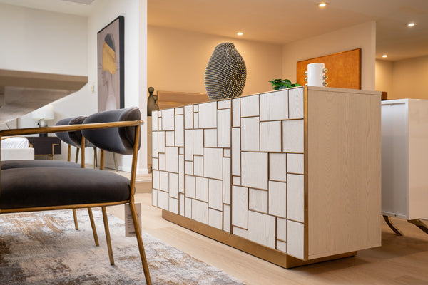 Update your dining room with the Auer Buffet! This modern piece features an abstract contemporary unique design with cream ash wood veneer and brushed gold accents. With three cabinets with shelves, the Auer offers ample space for all of your dining accessories; from platters to glassware, they can be stored safely and neatly inside.