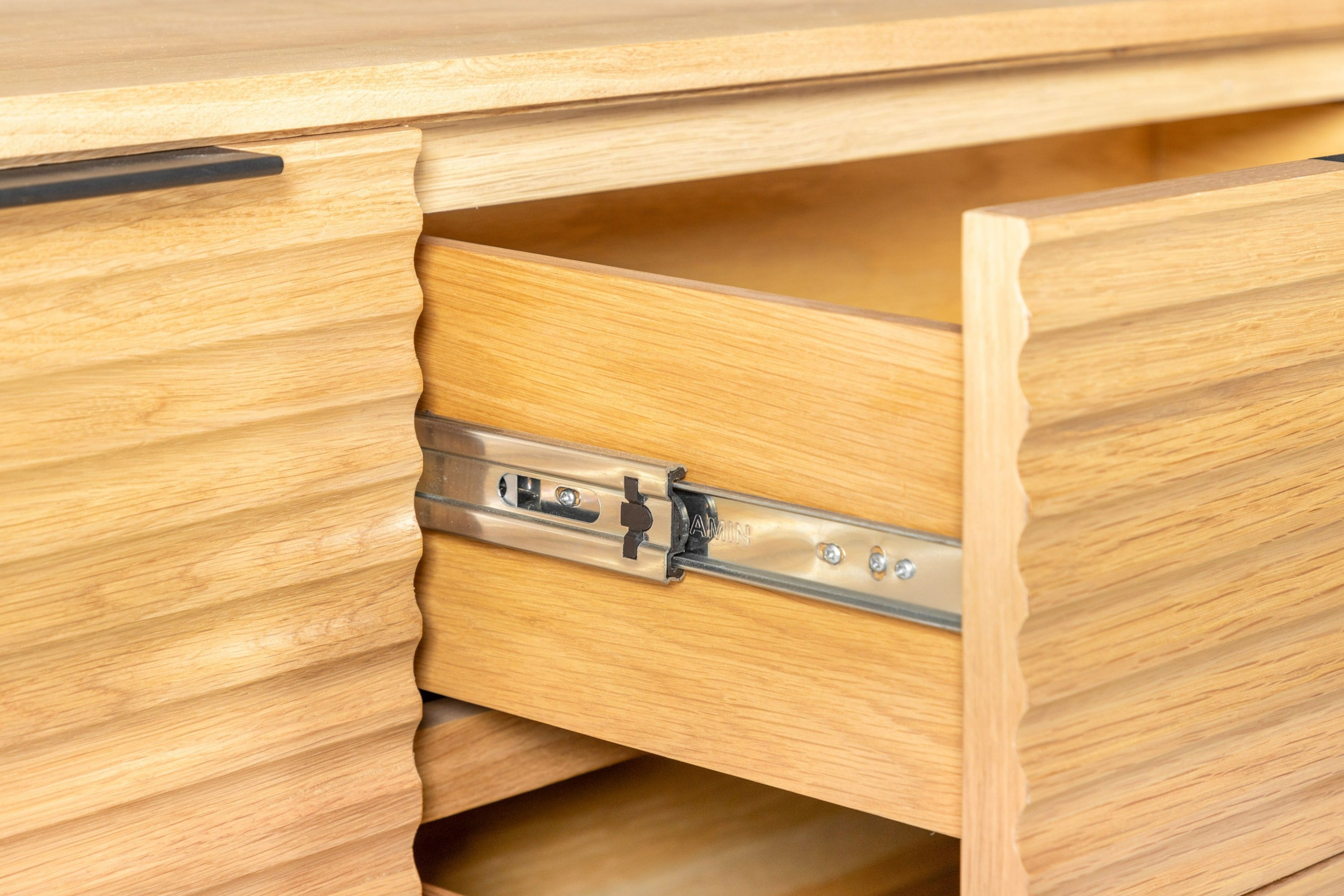 The Modrest Seattle Modern Natural Oak Buffet is a horizontal buffet/sideboard made from solid and manufactured wood, specifically oak. Its natural color complements various interior styles. With three drawers, two doors, and two interior shelves, it offers ample storage space. The removable metal handles and black drawer handles add a touch of sophistication. Plus, it comes fully assembled for your convenience!