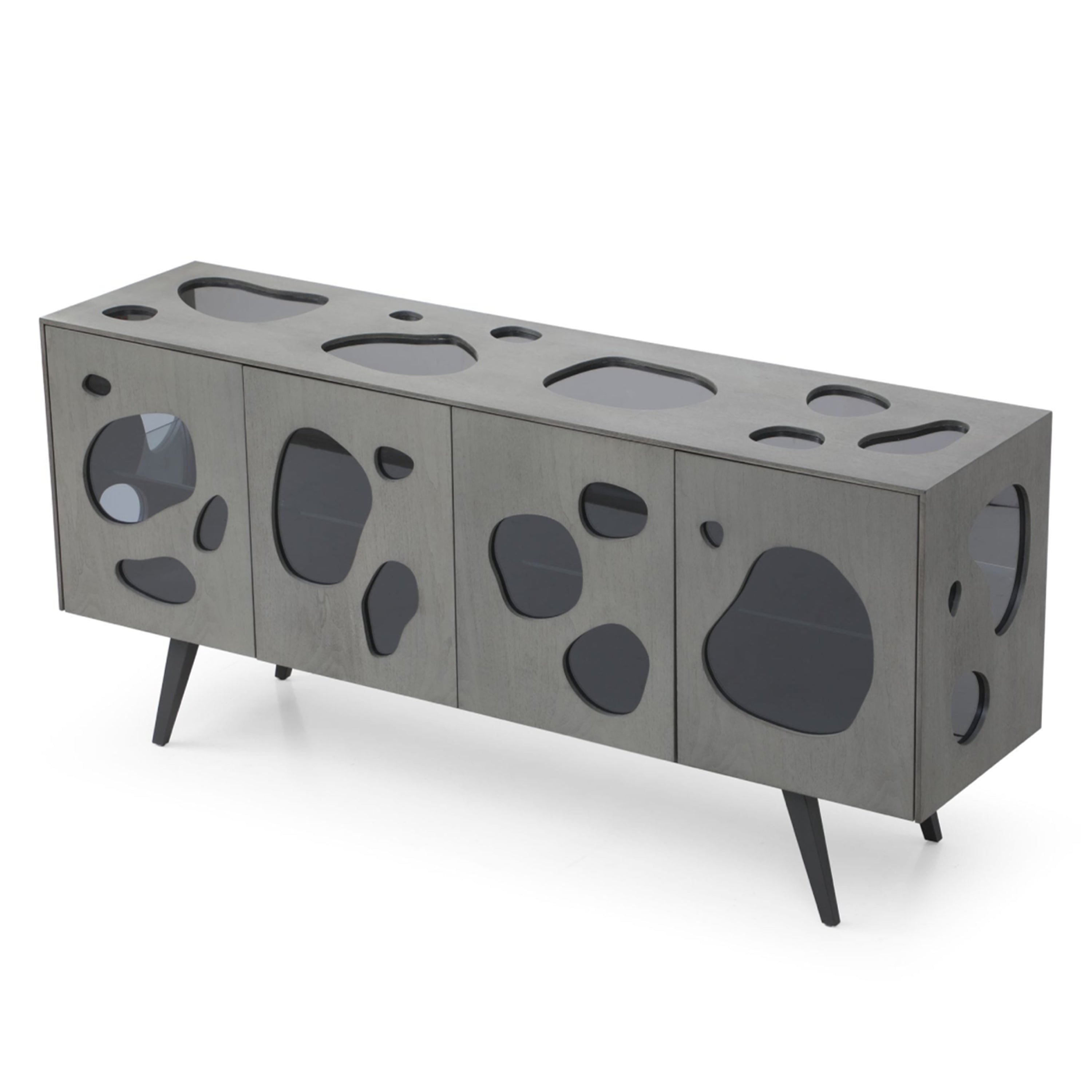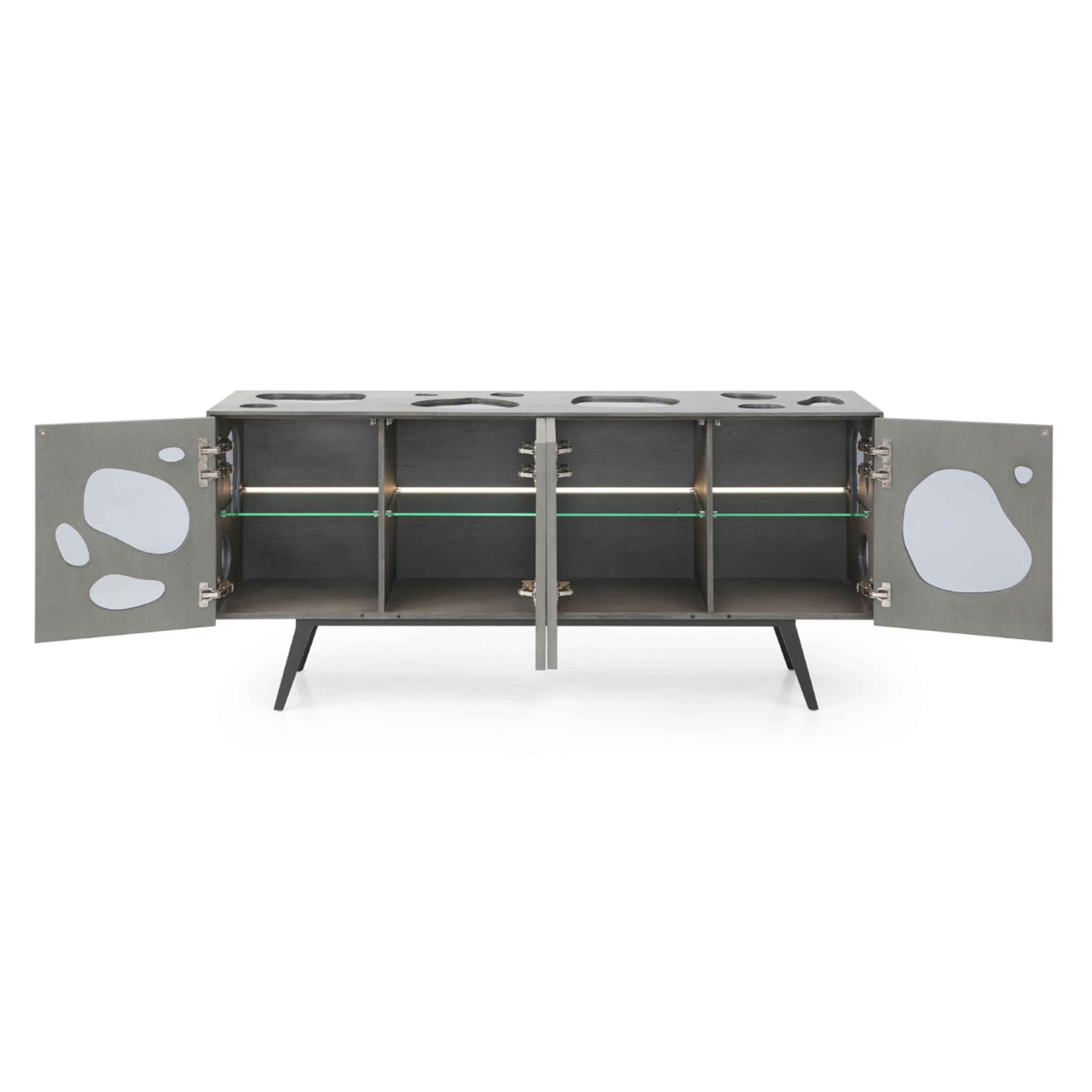 The Fontana Buffet is a unique marvel of modern design. Finished in a matte grey walnut veneer, the faces of the buffet are broken up by sporadic amoebas shapes that seem to dance on its surface. Four magnetic doors open to a gorgeous glass shelf with a lit panel. This gorgeous buffet is bursting with features that all converge to create the perfect conversation piece in your home.