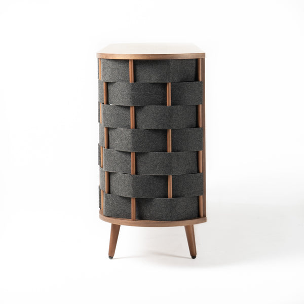 The Sheridan Sideboard-Buffet will make a wonderful addition to your dining room! It combines the three elements of good taste: attractive to the eye, made with excellent quality materials and multifunctional. The grey woven fabric and Walnut Wood Veneer finish bring a rustic and earthly aesthetic to the room and the combination of sliding and cabinet provide ample space for your dining accessories such as platters, glassware and more. The Sheridan collection includes a matching dining table and dining chairs.