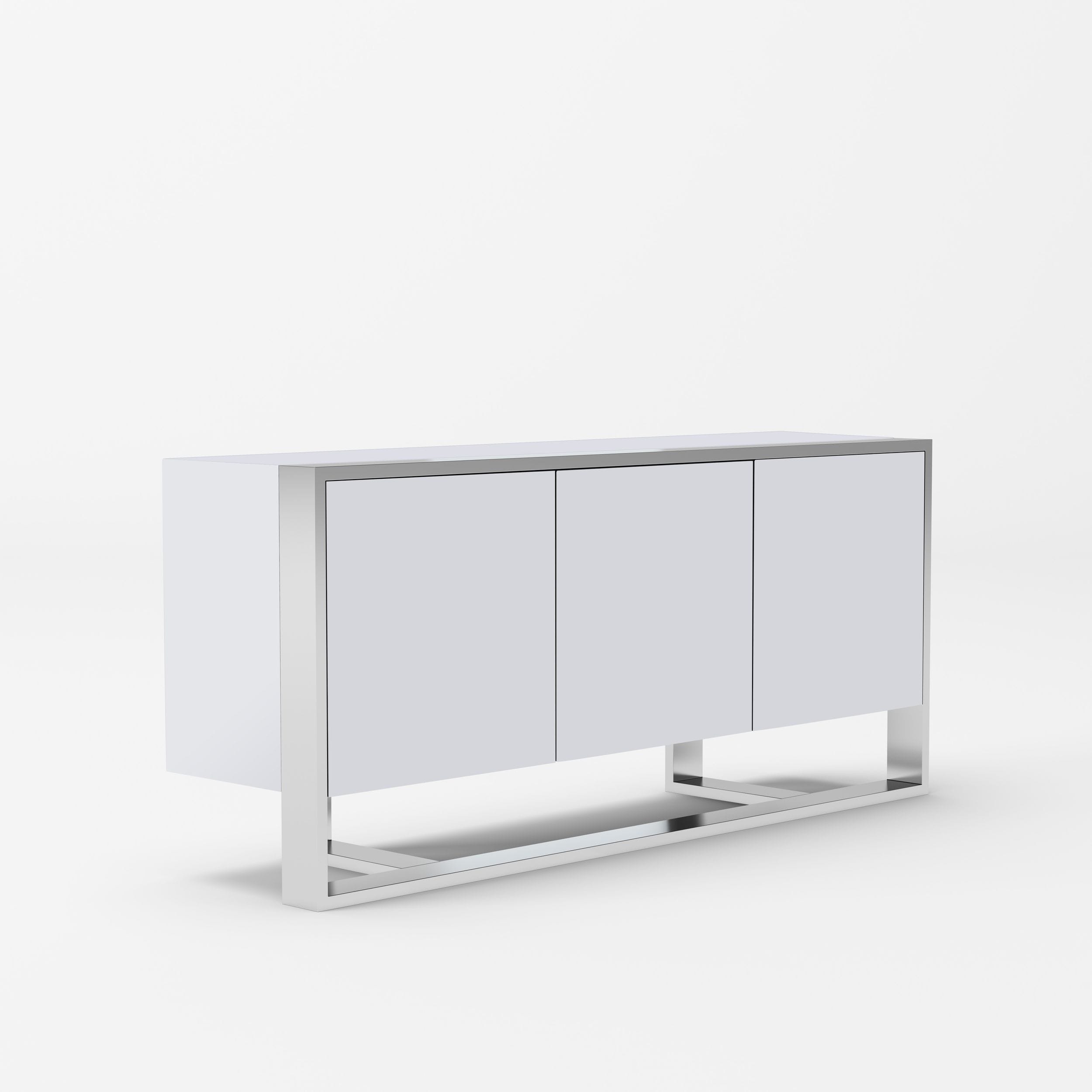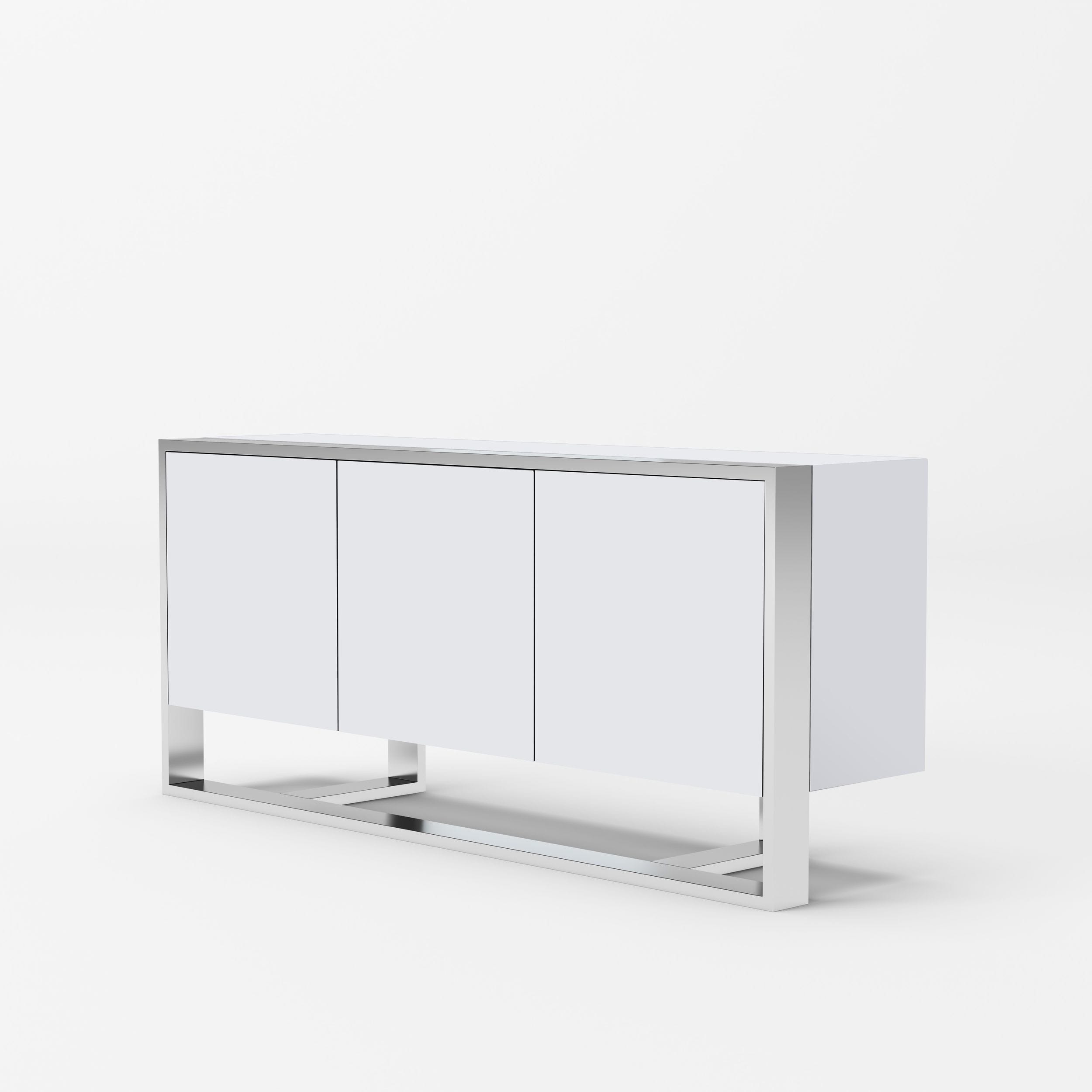 The Fauna Buffet is the unrivaled collection of glam and modern. This contemporary buffet has clean stainless-steel lines that accent and surround the white high gloss. Three soft close doors reveal adjustable interior shelves that can hold any number of dining essentials.