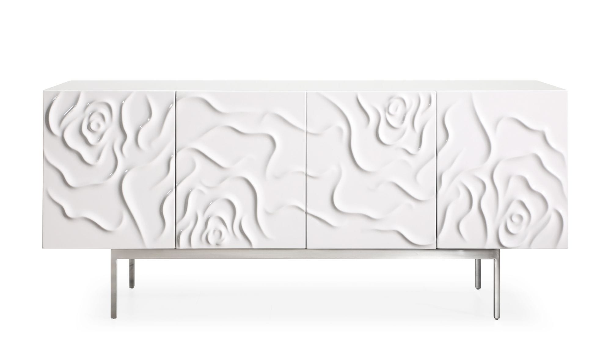 The Gwen Buffet is the star of any modern room. The high gloss white finish is luxurious and expertly executed. This show stopping buffet boast superior high glass finishing, carved rose details, and plenty of storage. The four front doors have soft closing mechanisms that make the buffet beautiful and functional to boot! Style it in your Glam or Contemporary home.