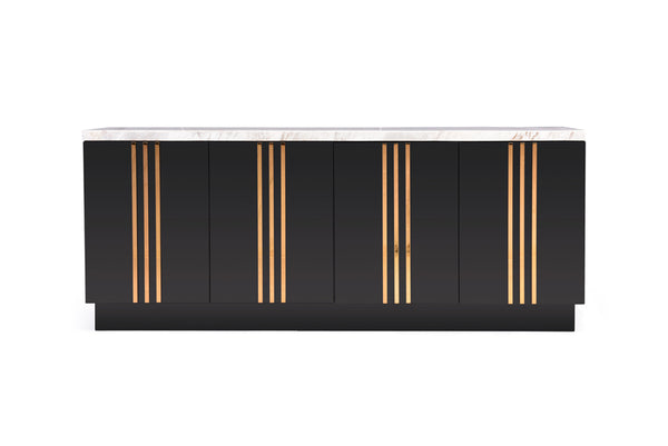 A striking piece for your dining room, the Kingsley Buffet is a dream come true. The black high gloss finish is dramatic and bold against the delicate rose gold accents. A thick marble top finishes the piece with a flair. Four cabinets house a host of dining essentials. Perfect for your modern, contemporary space, this piece is a must have.