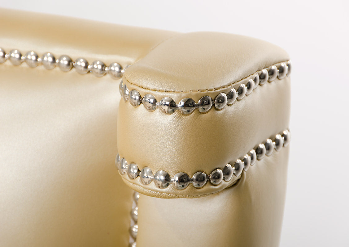 Glamorous and chic, the Monica champagne bed glows with luxuriance. Crystal trim lines the champagne colored leather tufted headboard. The outside corners of the headboard extend slightly outward to create an elegant composition. Silver bun footed legs slightly raise the Monica bed and finish the designs composition. Matching bedroom set pieces are sold separately. Also available in white. Matches the A&X Casa Luxury Collection.