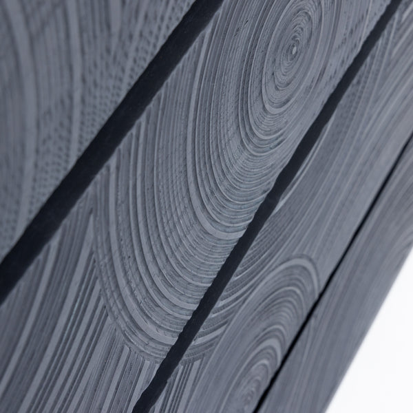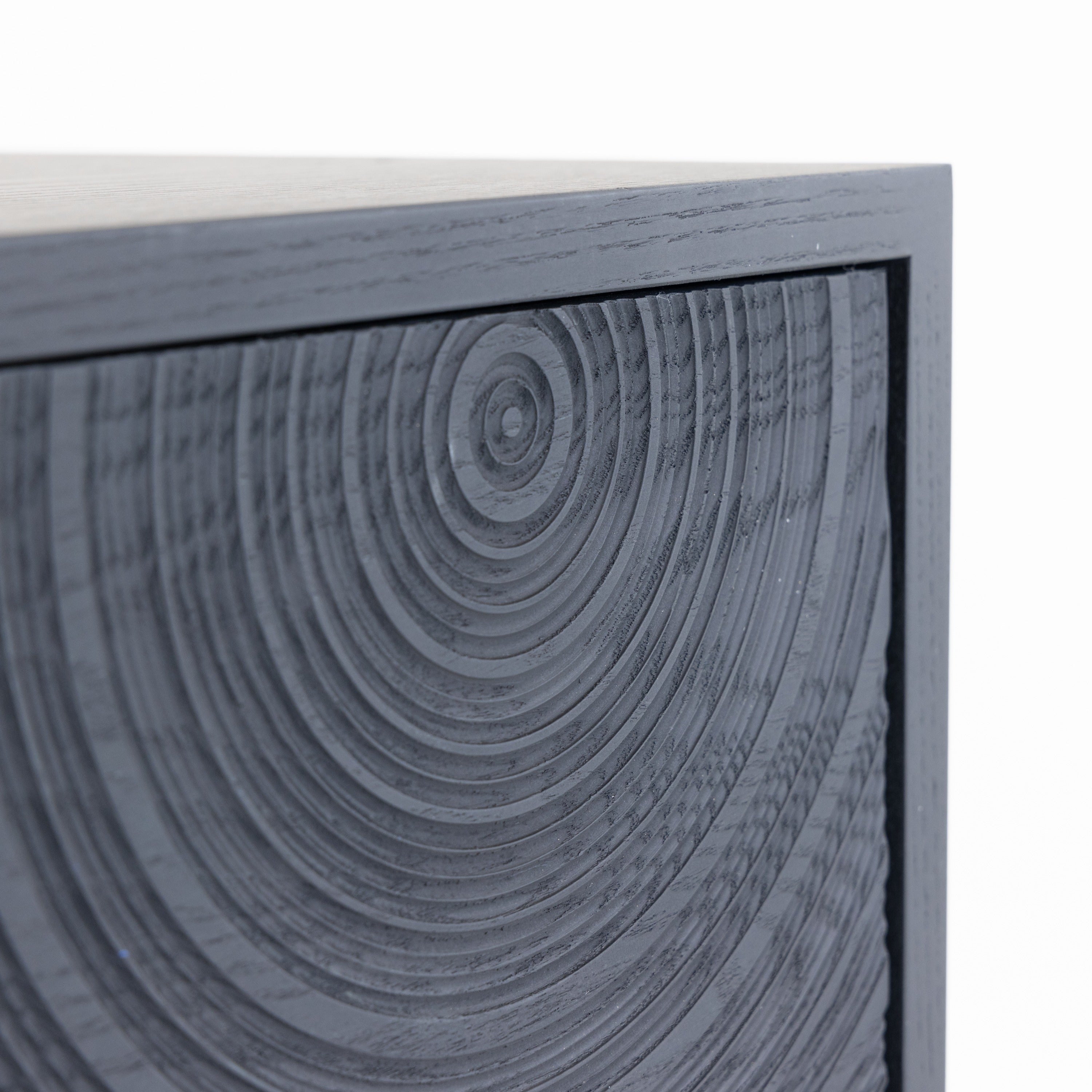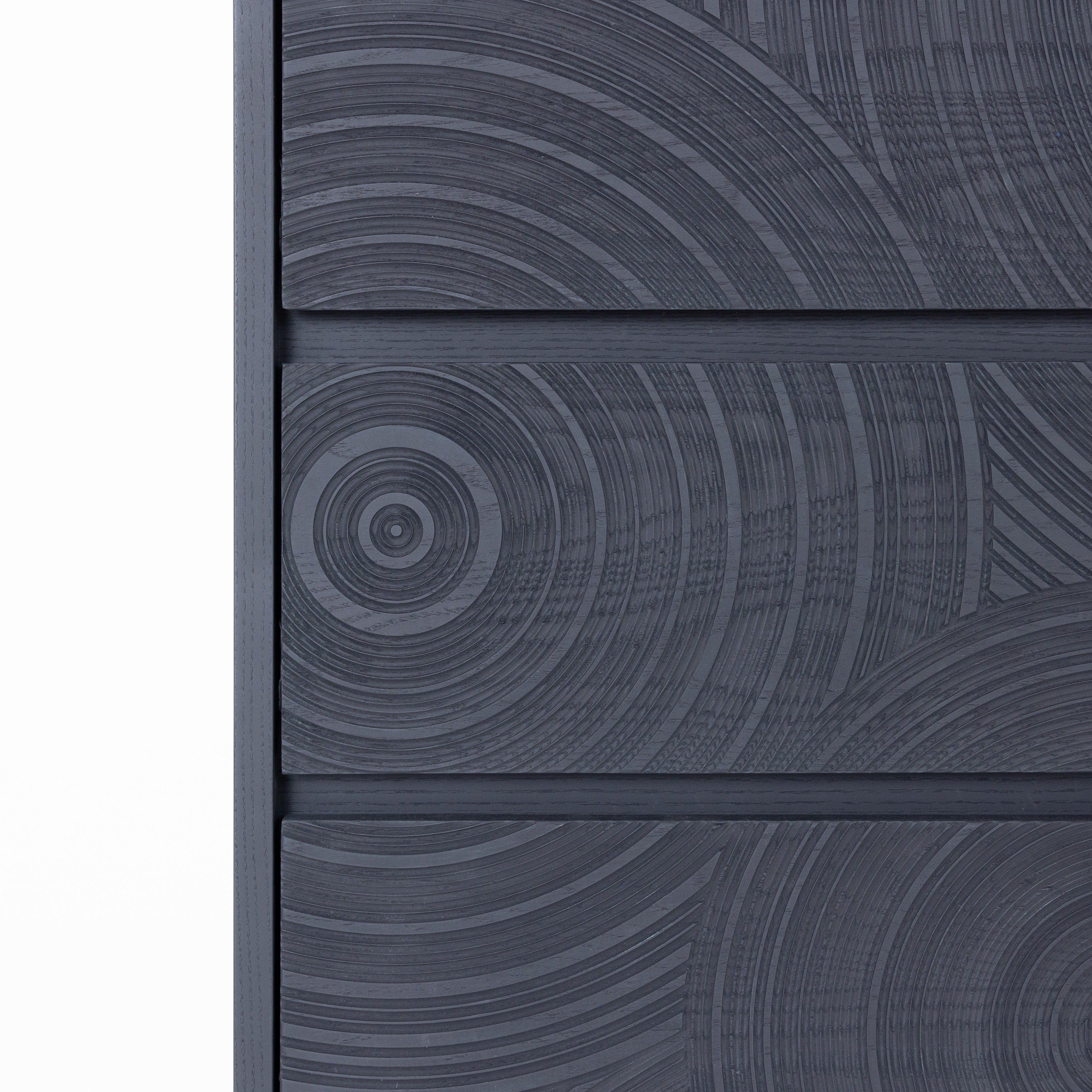 The Lamod Cirque Modern Black Ash Chest showcases an artistic blend of contemporary design and functionality. Its striking black ash finish is enhanced by intricately carved circular patterns that add depth and texture. The five spacious drawers provide ample storage while maintaining a sleek silhouette. Supported by elegant metal legs, this chest stands as a statement piece in any room, effortlessly merging style with practicality. Ideal for modern interiors, it offers both visual appeal and utility.
