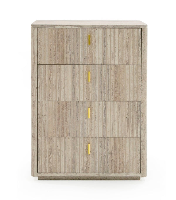The Roma Chest comes from our new Roma Bedroom collection! This vertical chest features four drawers with soft/self closing drawers and elegant golden metal handles. The surface of the piece is a faux travertine laminate finish all over. The Roma Chest combines excellent quality material and suburb design that makes it a stunner in any bedroom space. The Roma collection also includes a dresser, mirror and nightstand as well as matching living, dining and office furniture!