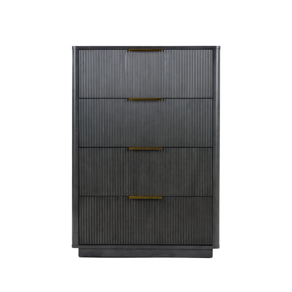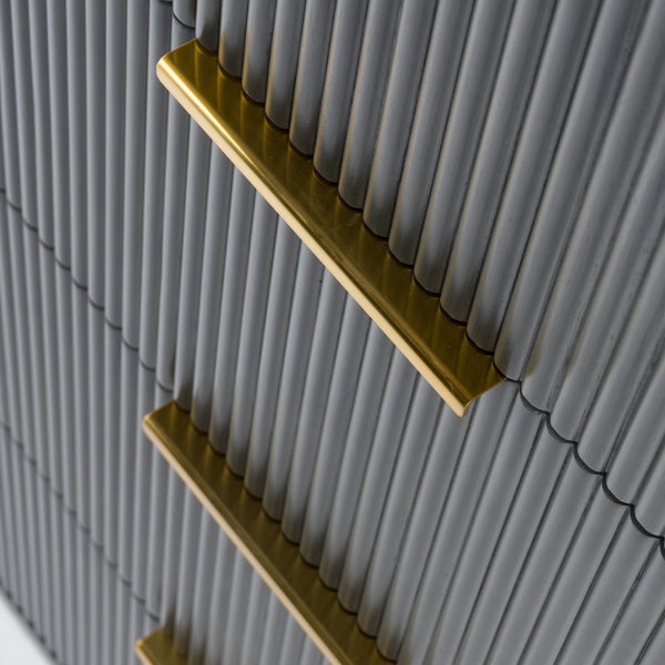 The Nova Domus Santa Monica Modern Grey Wash Chest combines contemporary elegance with functional design. Finished in a sleek grey wash, its textured, ribbed facade adds depth and visual interest, while the brass handles offer a touch of sophistication. This chest features four spacious drawers, perfect for organizing clothing or accessories, seamlessly blending style and practicality. Its minimalist silhouette makes it a versatile addition to any modern space, enhancing both aesthetics and utility.