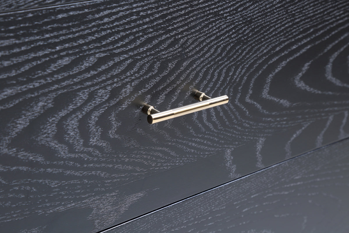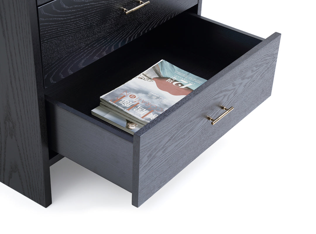 Providing vertical storage for your bedroom items, the Modrest Wales Modern Smoked Ash Chest is designed with 5 soft closing drawers. Polished with a luxurious smoked ash veneer finish featuring remarkable wood markings, it features brass drawer handles and accents. This tall drawer leaves an open space on the floor so you can still slip in your shoes under it.