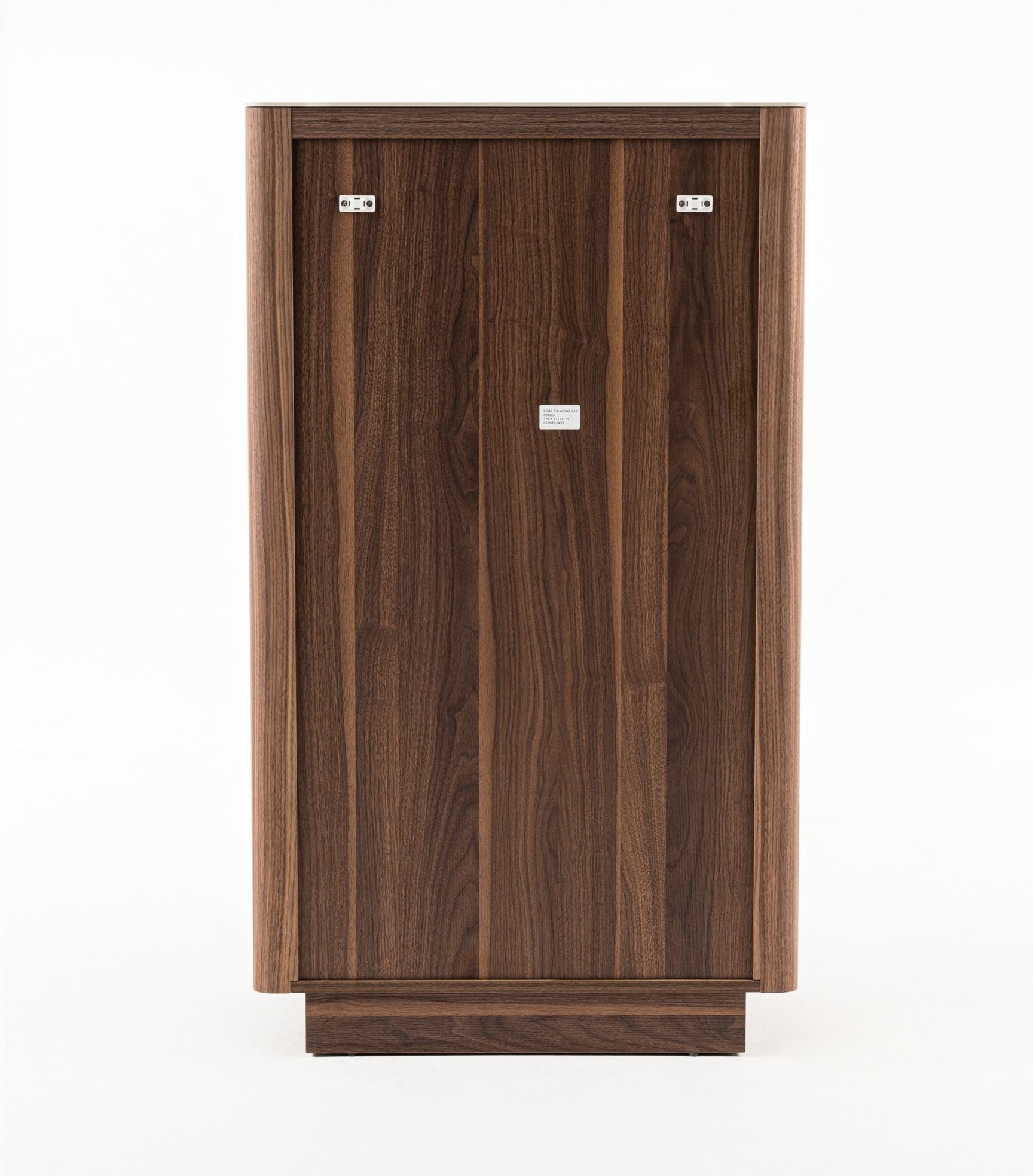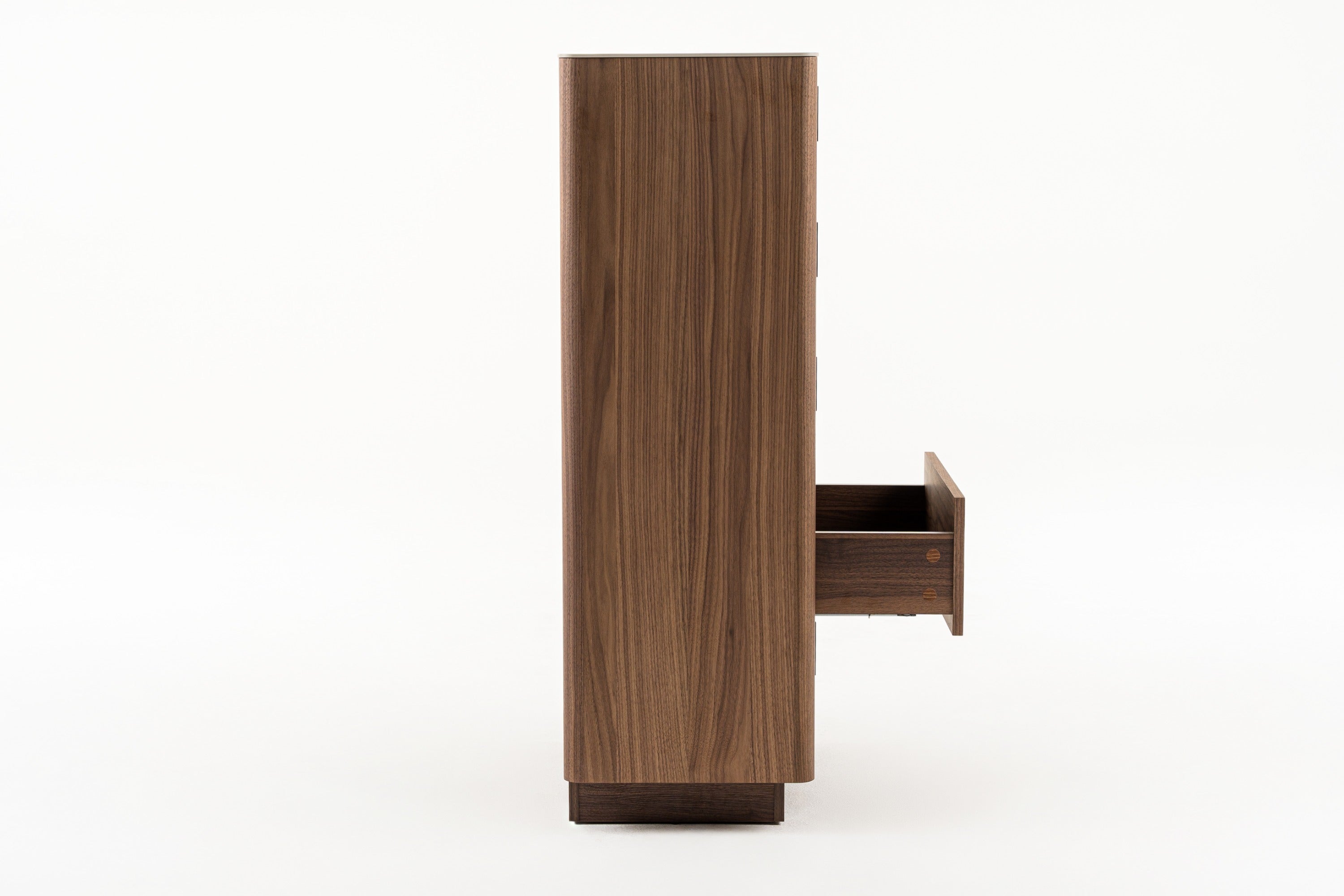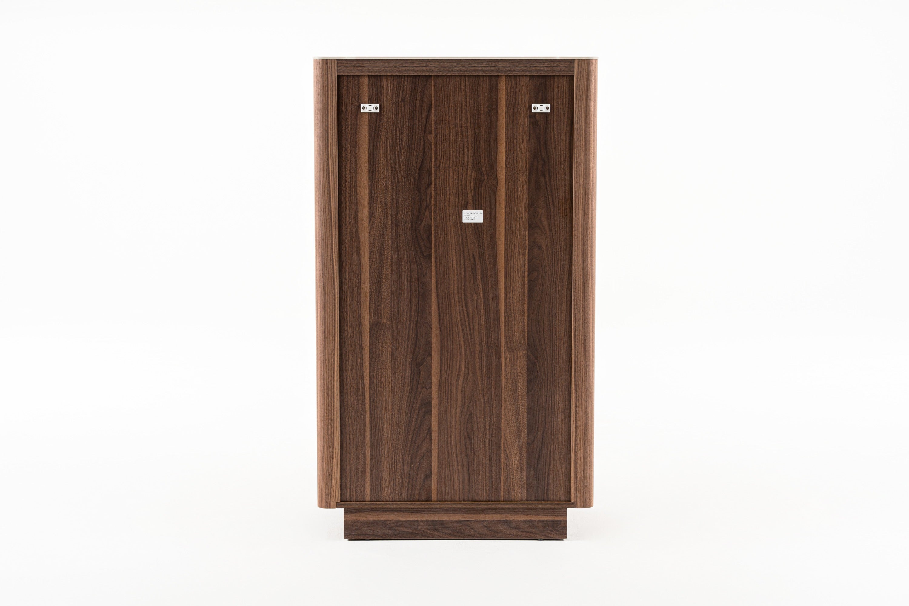 The Modrest Chelton Chest is a gorgeous example of Mid-Century design. The curved walnut veneer legs extend all the way to the top of the chest. A white ceramic top with curved edges finishes the top of the piece. Three walnut veneer faced drawers have black vertical handles and can handle all your dining needs.