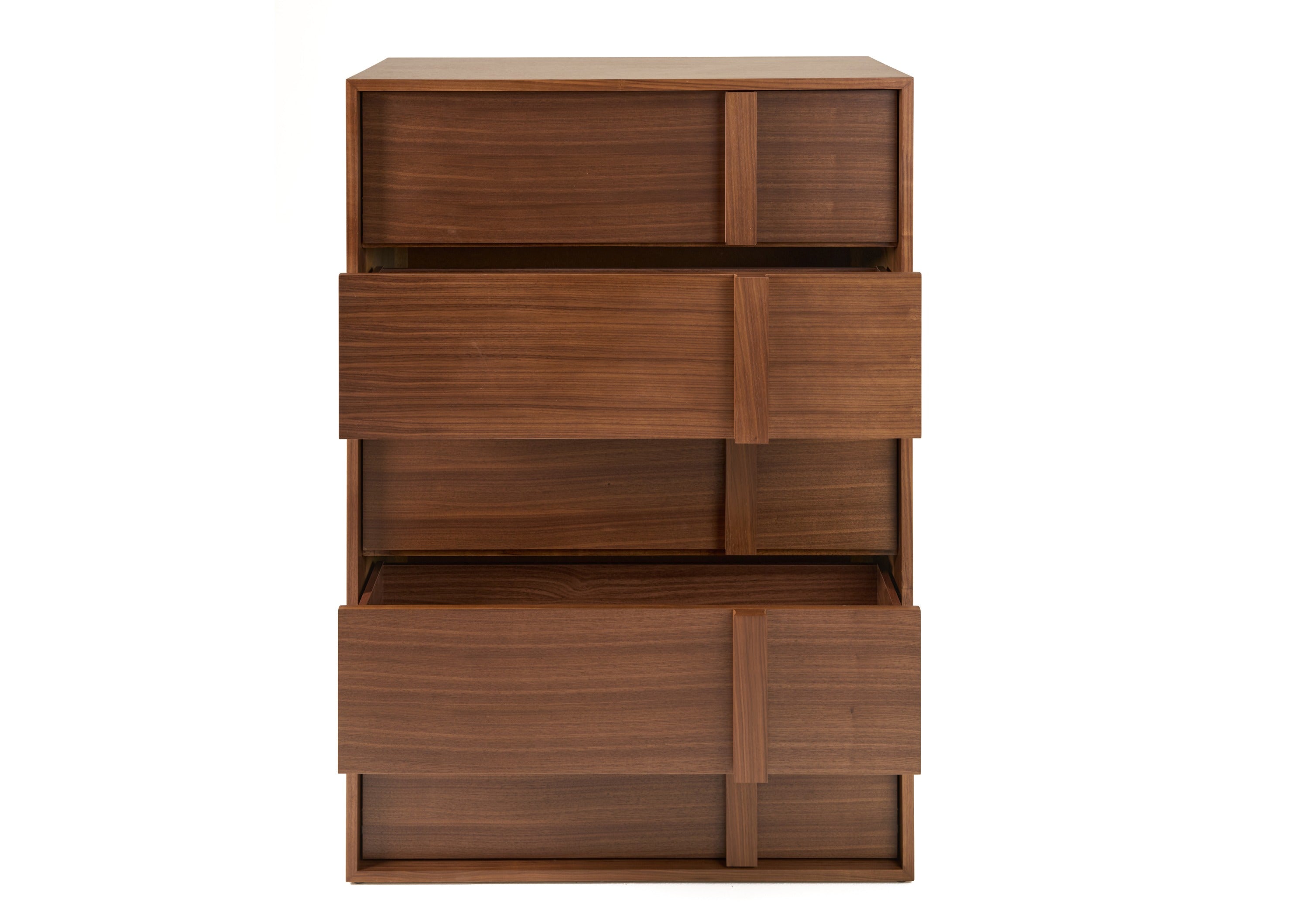 This five-drawer modern walnut chest will provide ample storage room. Each drawer features an integrated wood pull, which adds an extra element of style. There's a rich walnut-finished veneer on the chest, too, which adds warmth.