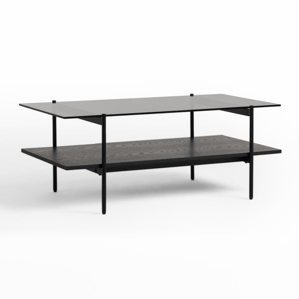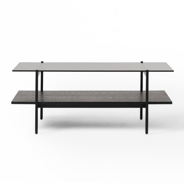 The Conley Rectangular Coffee Table is made from tempered grey glass and black ash veneer. The stacked design allows for storage below and makes a great center piece for your friends or family in your living room!
