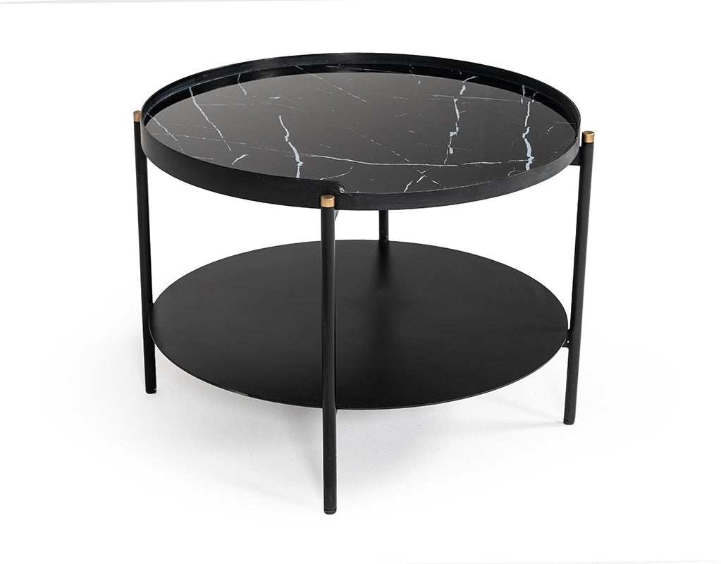 Transform your living space with the ultra-sleek Modrest Randal Modern Round Black Metal Coffee Table. Featuring an exquisite black marble painted round top with an open round under shelf, it offers a wide area for you to place items in an orderly manner. A black metal base holds the lower shelf sturdily. Anchoring this coffee table are black coated legs with gold-coated tips. Add this modern round black metal coffee table in your home décor for that urbane feel!