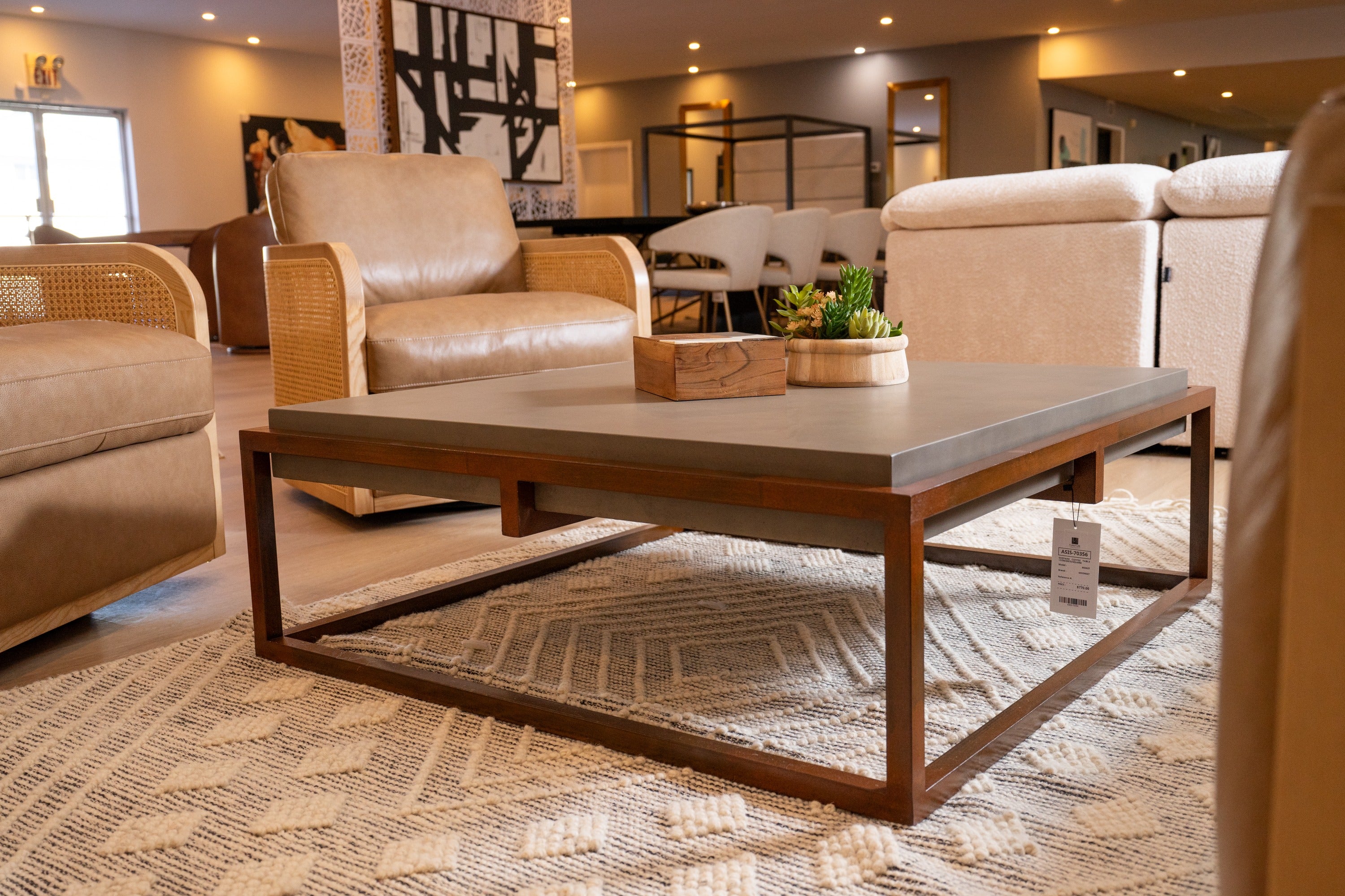 The Modrest Shepard Modern Concrete Coffee Table features a brilliant combination of dark grey fiber reinforced natural concrete table top on a square rusty steel frame. Exuding elegant durability, this modern concrete coffee table weighing 66 pounds is a sure scene stealer in any living room space.