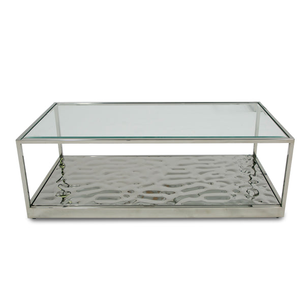 Bring this stunning, contemporary coffee table into your living space! The Modrest Braxton Clear Wave Glass Coffee Table has a tempered glass top and a wavy stainless steel lower base with an opening in the middle. This modern piece sports a unique design that makes it a conversation piece for one s living room.