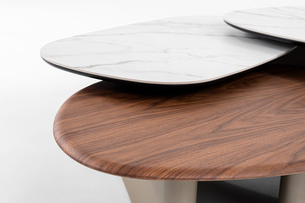The Modrest Robson Multi-Tiered Coffee Table seamlessly blends modern aesthetics with functionality. Its design features three distinct table tops: an upper surface combining ceramic and walnut materials, a base made of manufactured wood with a gold metallic finish. Whether for displaying decor or serving coffee, this coffee table adds elegance to any living space