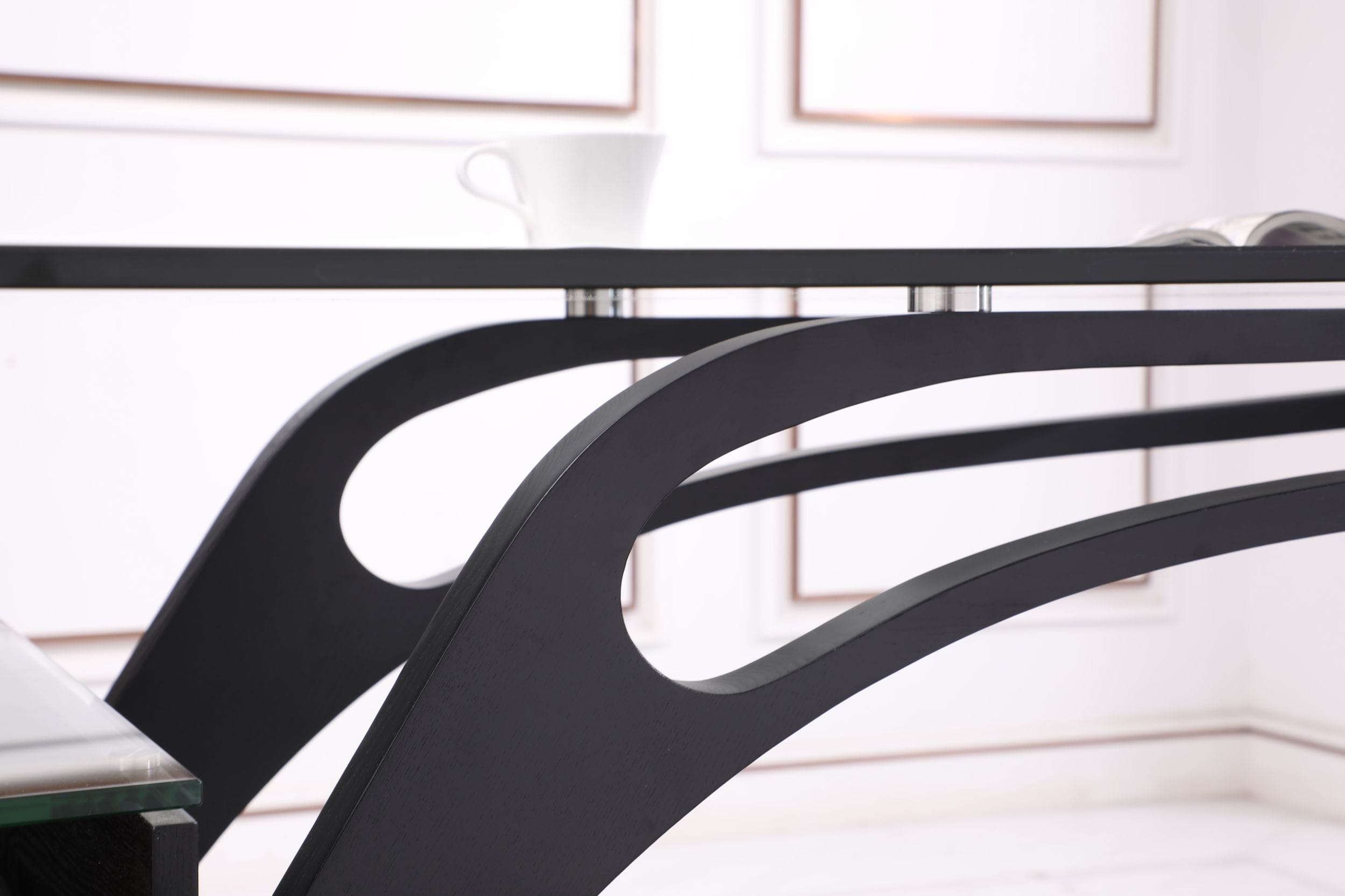 The glass top of the Suffolk Desk rest gently on top of it's base, as if floating. The Black Ash Veneer finish and curvalinear supports of the base are bold and elegant. This modern desk has plenty of storage with five drawers and two open shelves. There is plenty of storage and class to be found in this exceptional piece of furniture.