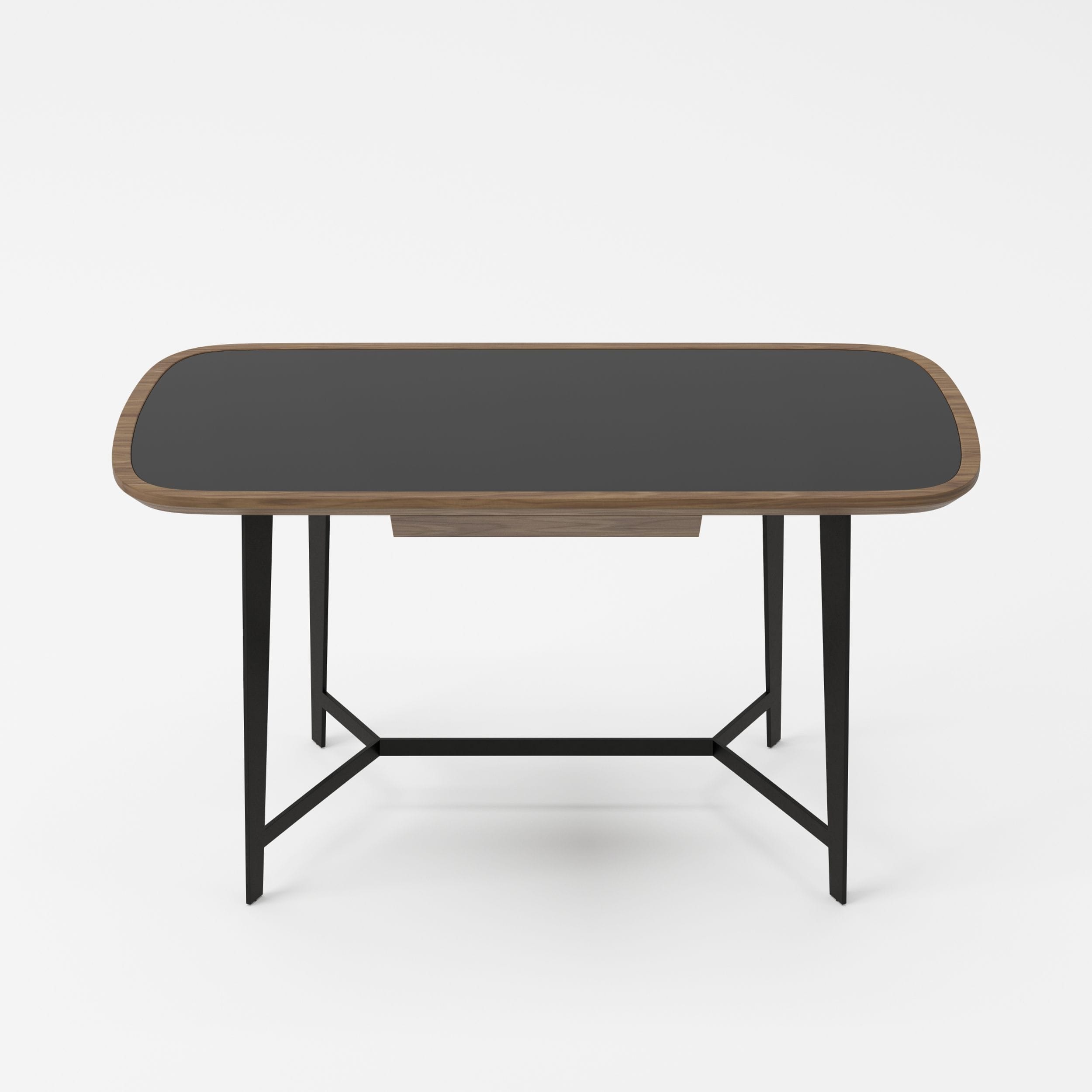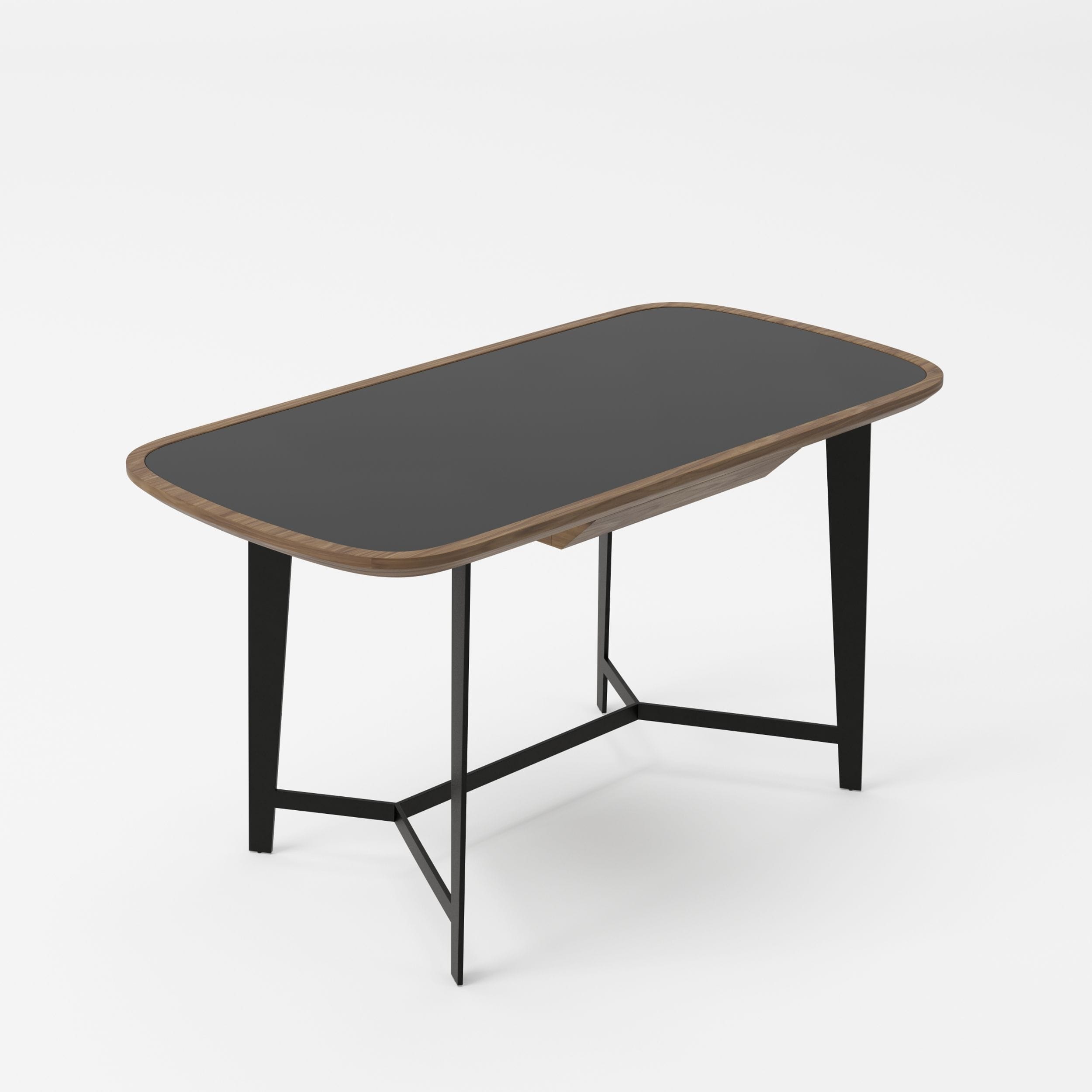 The black steel base, walnut veneer, and black glass insert of the Girard Desk makes it incredibly unique. The tapered legs hint to Mid-Century style while the clean lines add a touch of modern style. The desk pairs perfectly with the Glencoe Bookshelf.