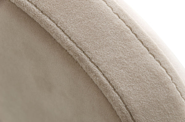 Clean lines and ultra-soft beige velvety fabric come together in perfect harmony with the stainless steel rose gold straight legs in the front and tapered in the back that creates a masterpiece of industrial minimalism. A perfect fit to coordinate with an urban industrial or minimalist dining table, in the office or by itself.