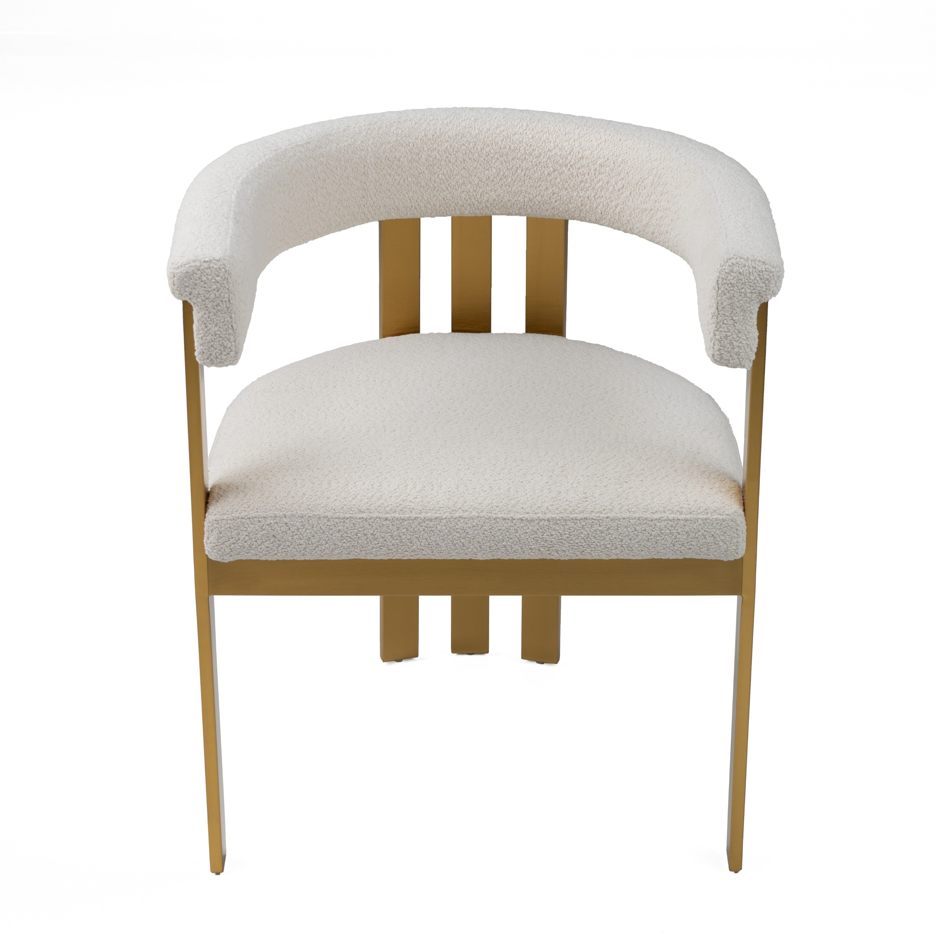 The Pontiac Dining Chair is the perfect glam style for your contemporary dining room. The gold stainless-steel legs contrast against the soft texture of the beige, sherpa velvet upholstery. The frame of this chair has a modern silhouette with a tri leg look but with a slanted back leg that gives the illusion of a five-legged dining chair.