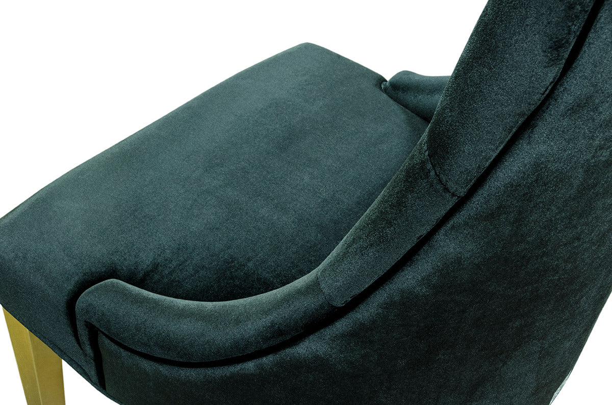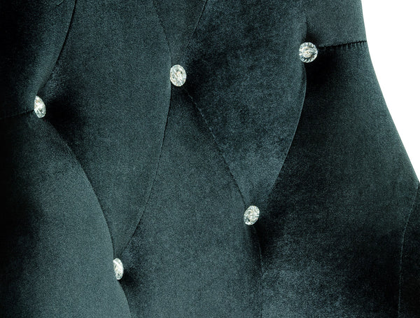 The Charlotte chair is upholstered in a soft velour fabric and enhanced by crystal tufts and quality stitching. Contrasting gold high gloss legs slightly curve outward to create movement in the design. Available with black legs in grey, purple and black velour.