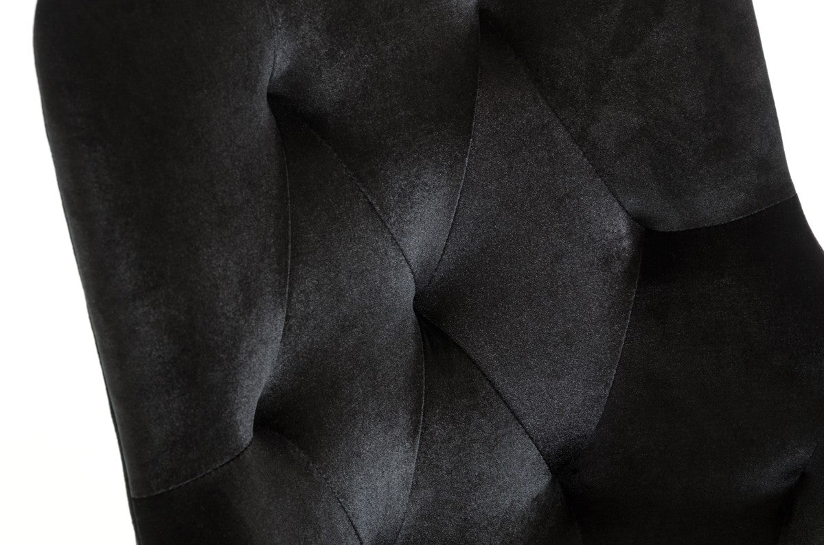 The Black Velvet Fabric covers the seat and back, elevated by tufted stitching to create a visual a combination of Classic and Contemporary styles. Sleek black gloss legs end in Rose Gold caps to create a luxurious finish.