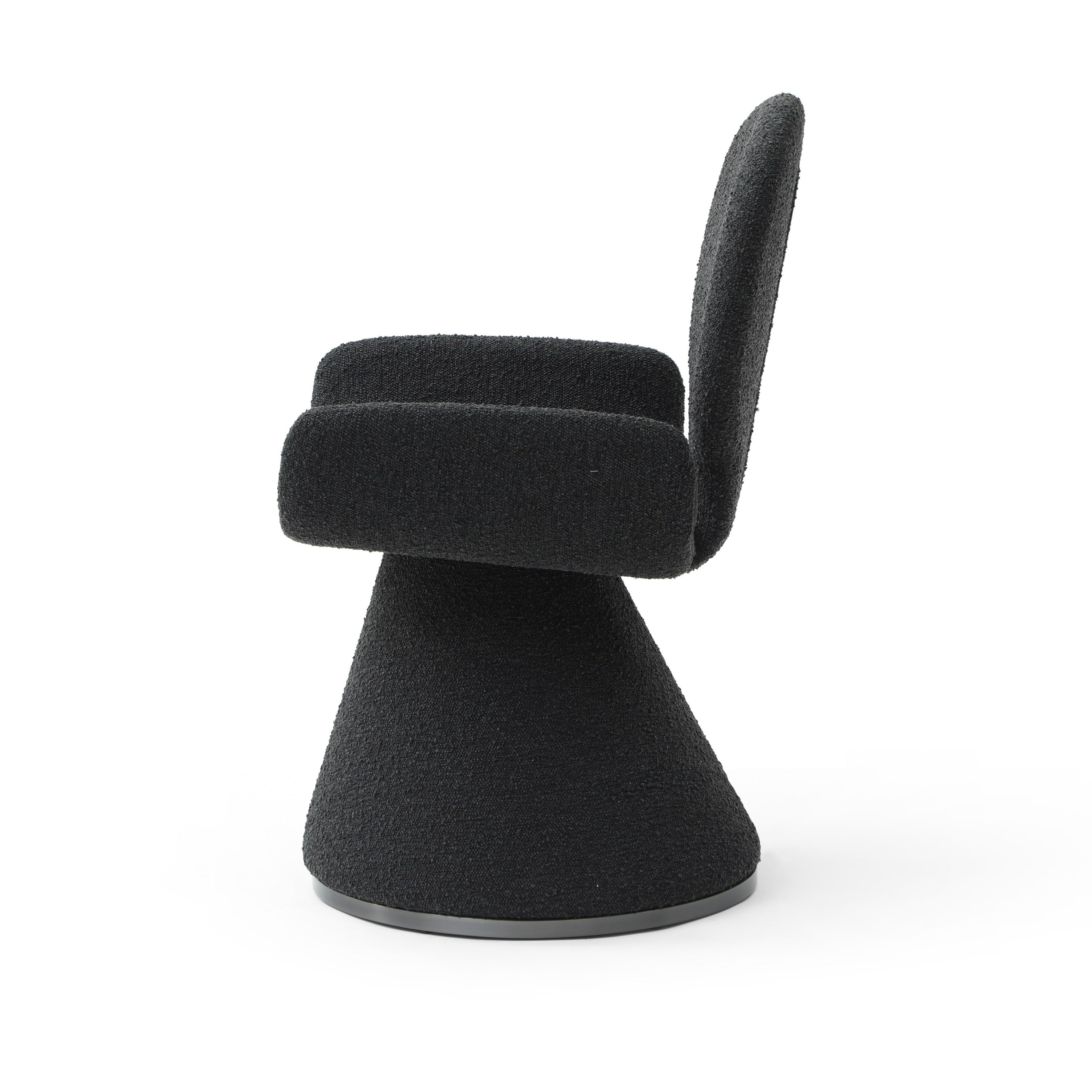 The Modrest Neptune dining chair exudes contemporary elegance with its unique design. Upholstered in plush black fabric, its soft texture invites comfort while the distinctive cone-shaped base adds a striking visual element. The chair features rounded armrests and a circular backrest, enhancing its modern appeal. Perfect for stylish dining spaces, its bold silhouette and sophisticated finish make it a standout choice for those seeking to elevate their interior decor.