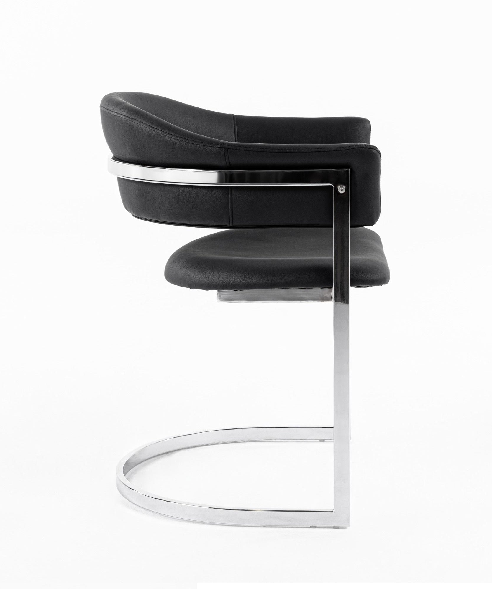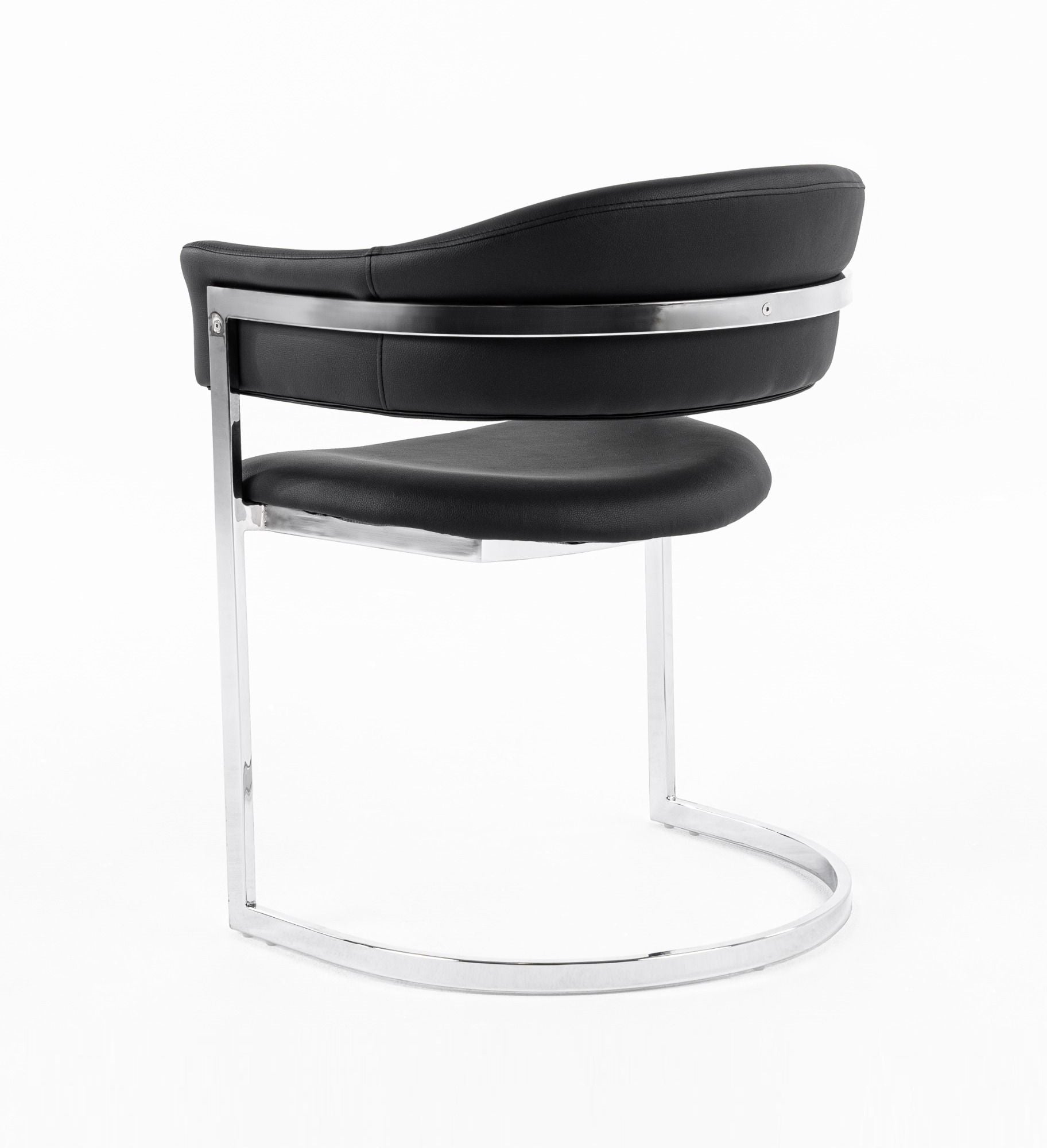 The Modrest Allie Contemporary Black Leatherette Dining Chair features luxury black leatherette upholstery in a sturdy stainless steel frame with a semi-circle base. This black leatherette dining chair is also available in white.