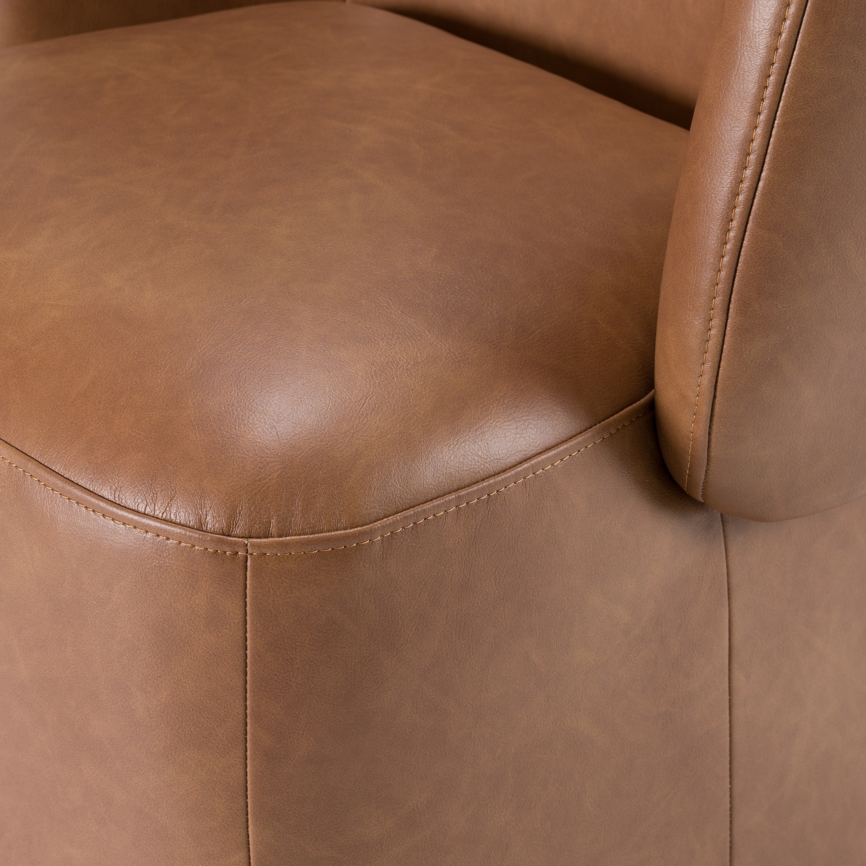The Modrest Standing Modern Brown Vegan Leather Swivel Dining Chair embodies contemporary elegance with its sleek, rounded design. Upholstered in rich brown vegan leather, it offers a warm and inviting aesthetic, while the plush cushioning ensures comfort during mealtime. The swivel feature adds functionality, making it perfect for dining or casual gatherings. With its unique shape and soft, textured surface, this chair serves as a stylish accent in any dining area, seamlessly complementing modern decor.
