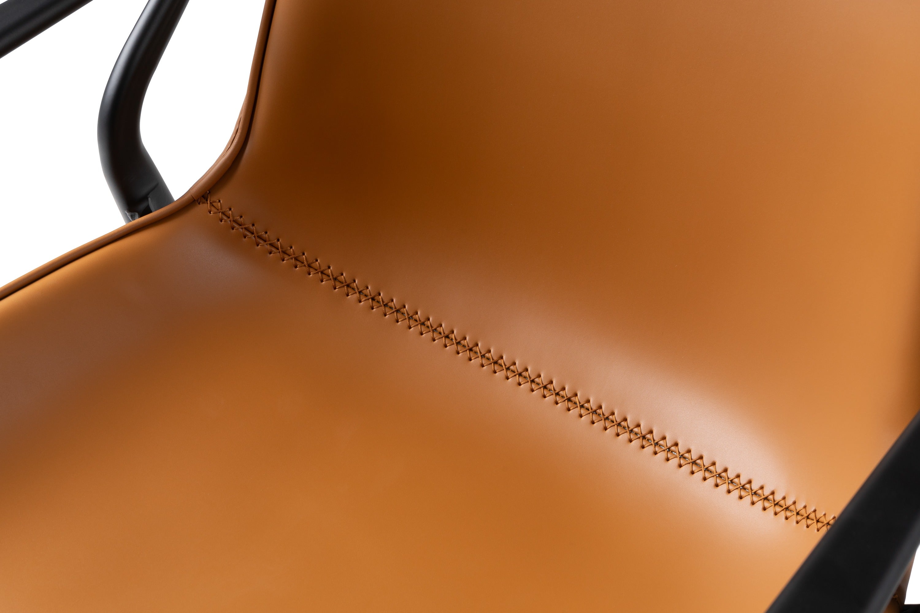 The Modrest Osprey Modern Camel Vegan Leather Dining Chair is a stylish and contemporary seating option. Upholstered in rich camel vegan leather, its curved silhouette offers both comfort and elegance. The sleek black metal arms and legs enhance its modern aesthetic while providing sturdy support. Ideal for chic dining spaces, this chair combines sophistication with sustainability, making it a perfect choice for eco-conscious design enthusiasts. This set includes two chairs, perfect for enhancing any dining experience.
