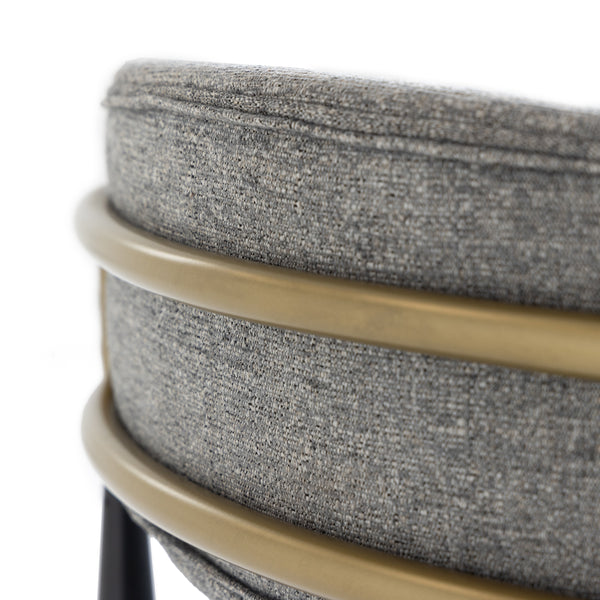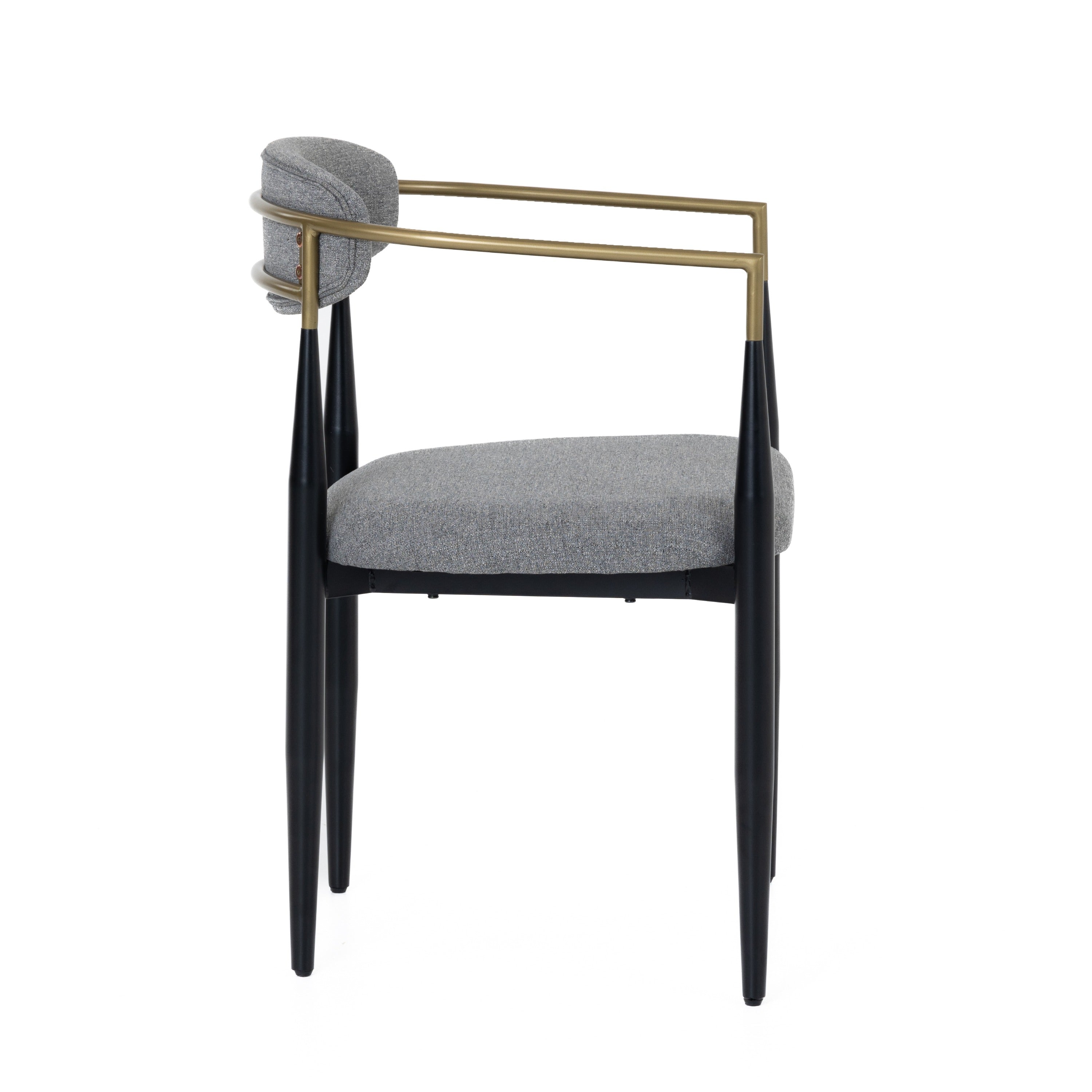 The Modrest Buchtel dining chair features a stylish Mid-Century Modern design, characterized by its medium grey upholstery and sleek gold armrests. The elegant black legs are tapered, adding a sophisticated touch to any dining space. This chair seamlessly combines comfort and contemporary aesthetics, making it a perfect addition to modern interiors. Ideal for both casual and formal dining settings, it enhances the overall decor with its chic silhouette and refined color palette.