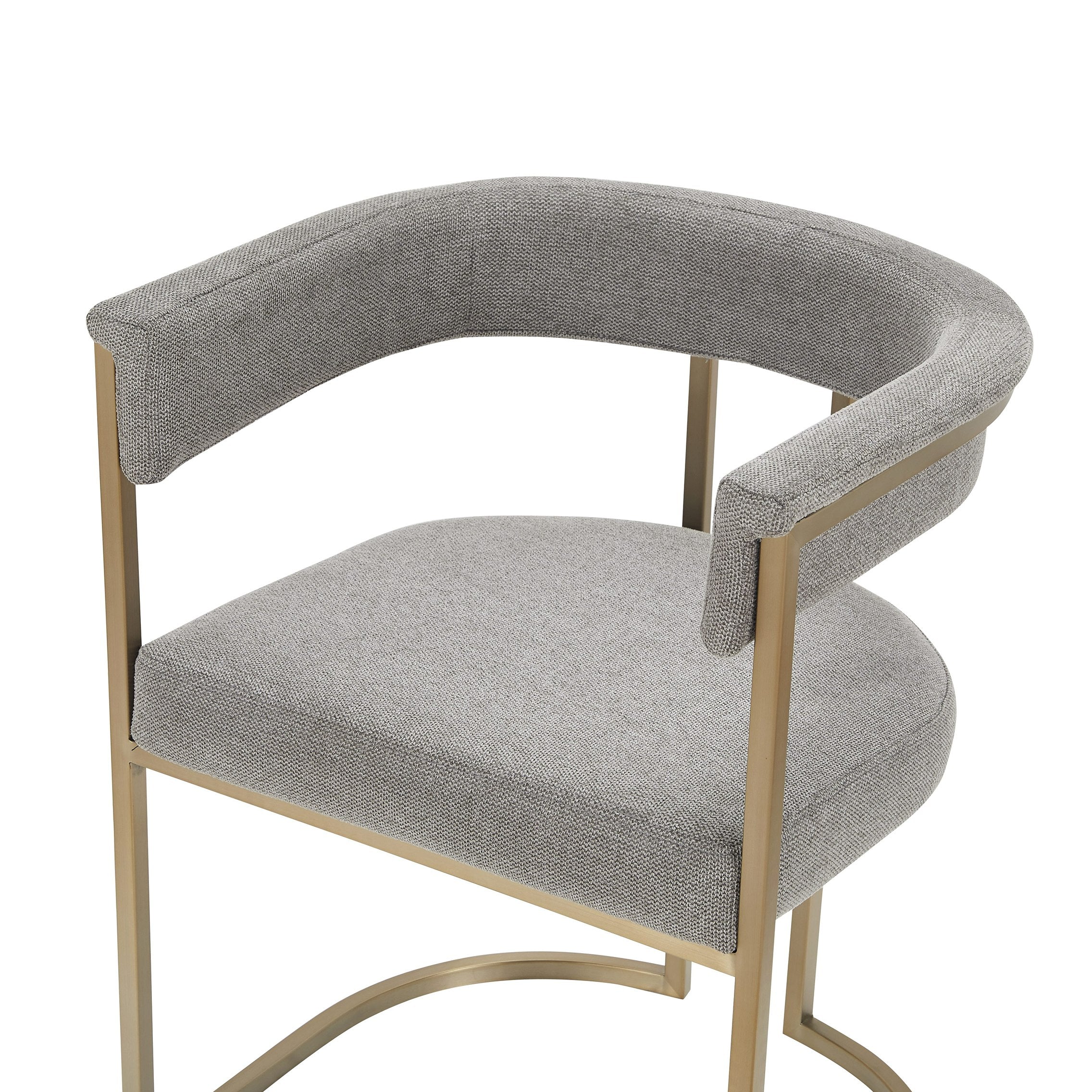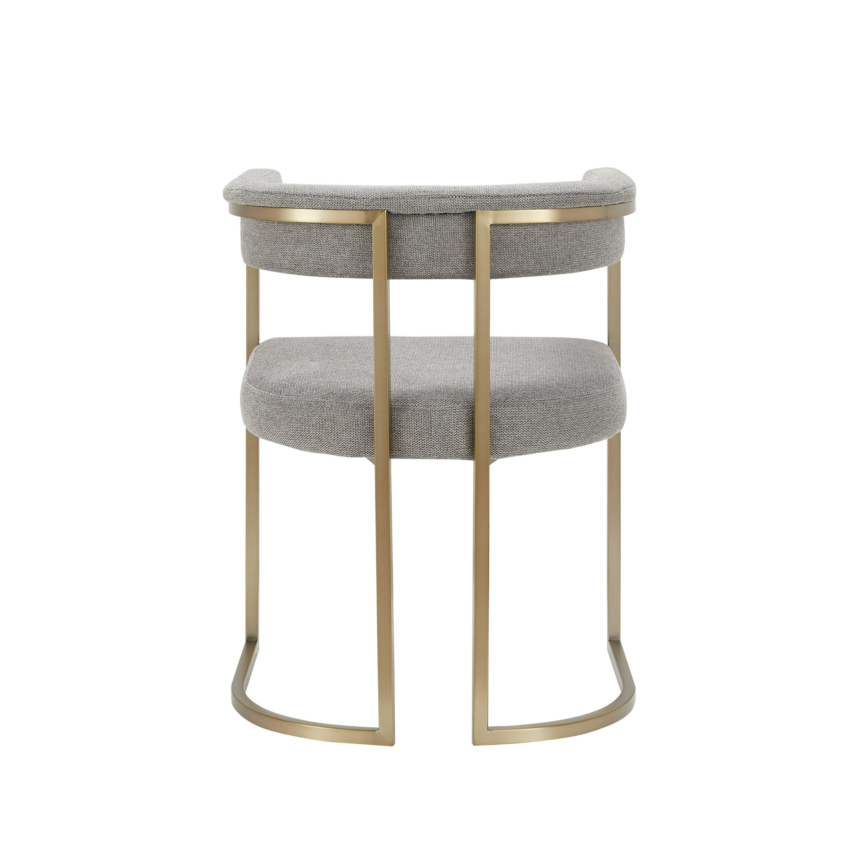The Modrest Byron Dining Chair combines modern aesthetics with elegant touches. Upholstered in soft grey fabric, its comfortable, curved backrest provides excellent support while adding a touch of sophistication. The chair features a sleek antique brass frame, enhancing its contemporary feel and providing durability. With its unique design and stylish finish, this chair is perfect for elevating any dining space, effortlessly blending comfort with a chic, modern look.