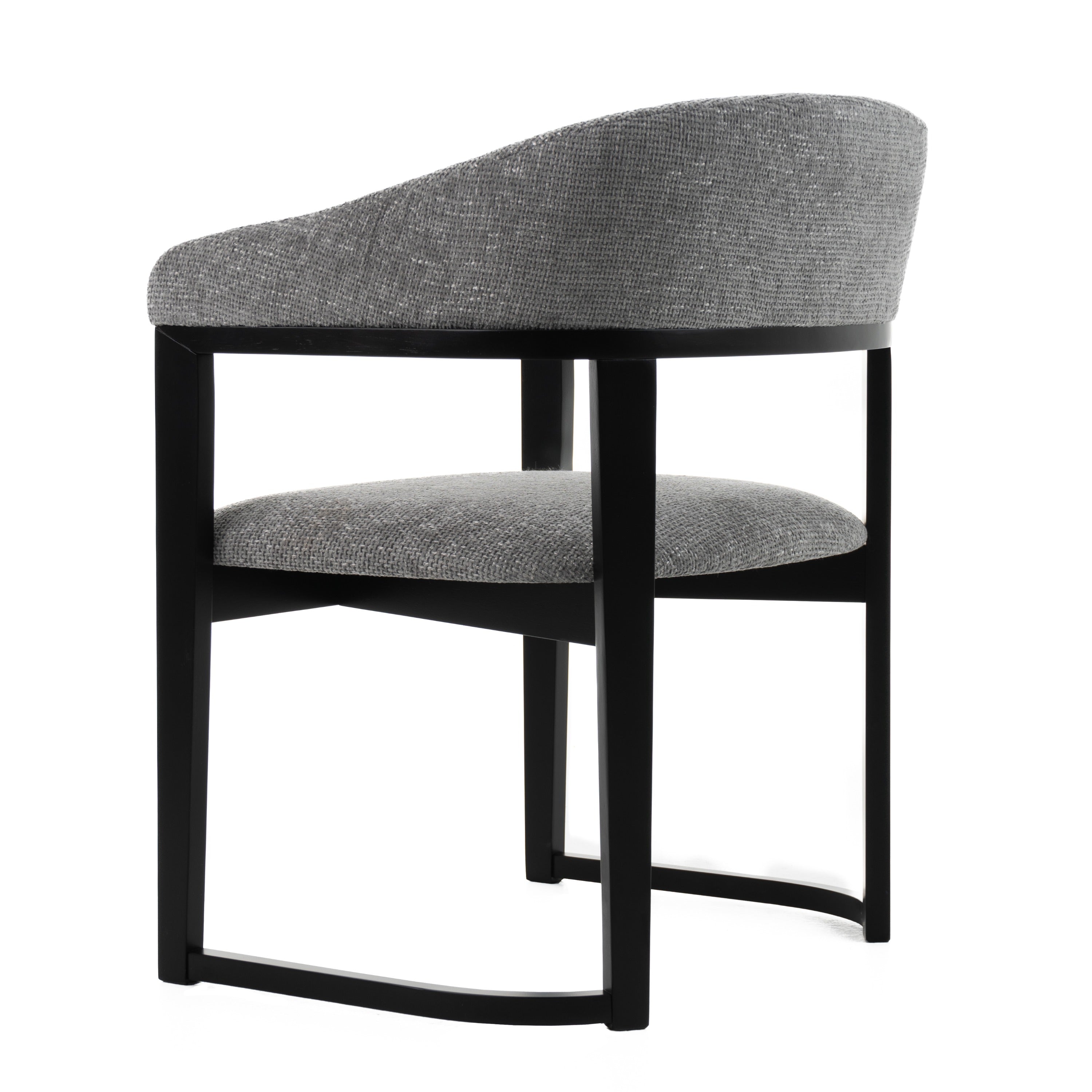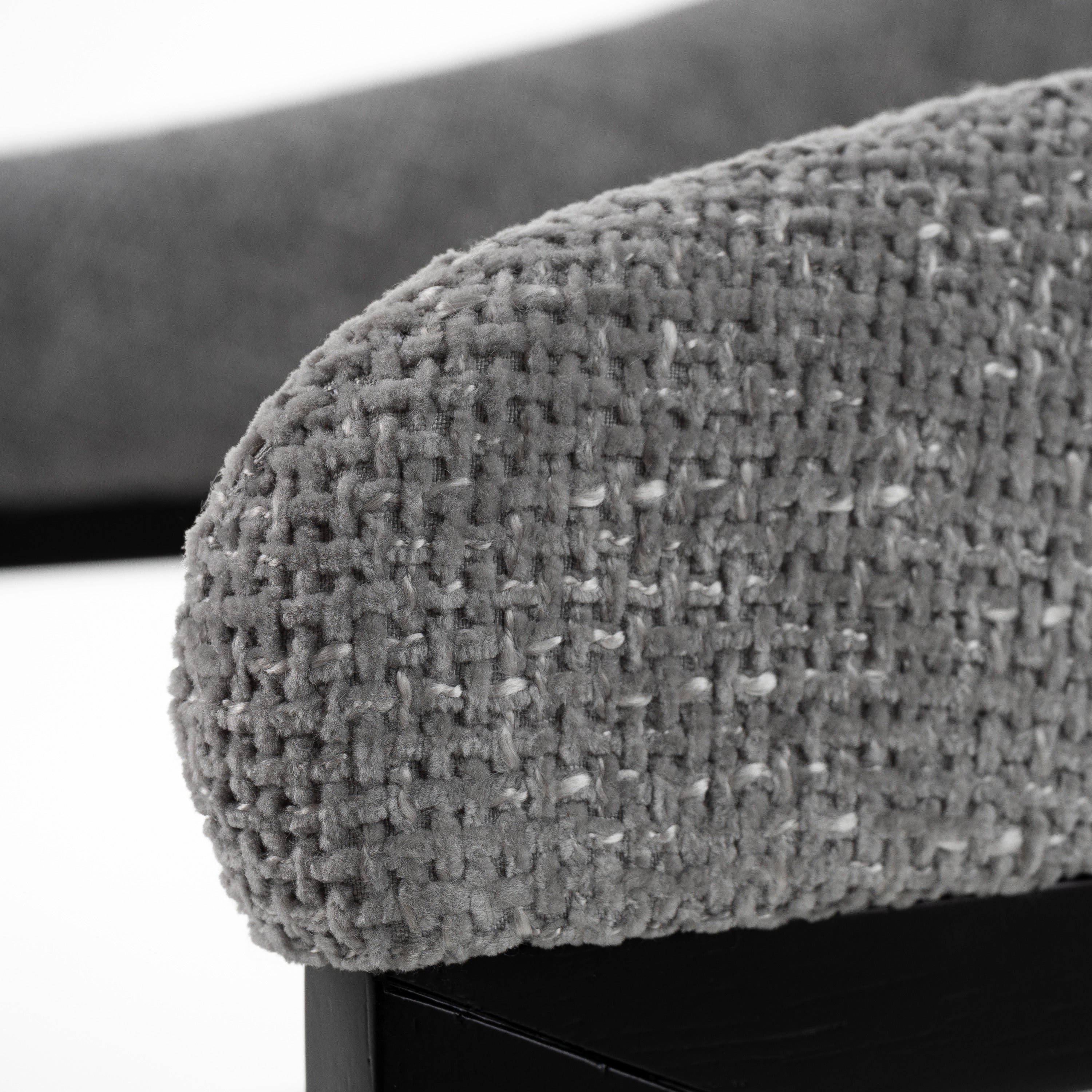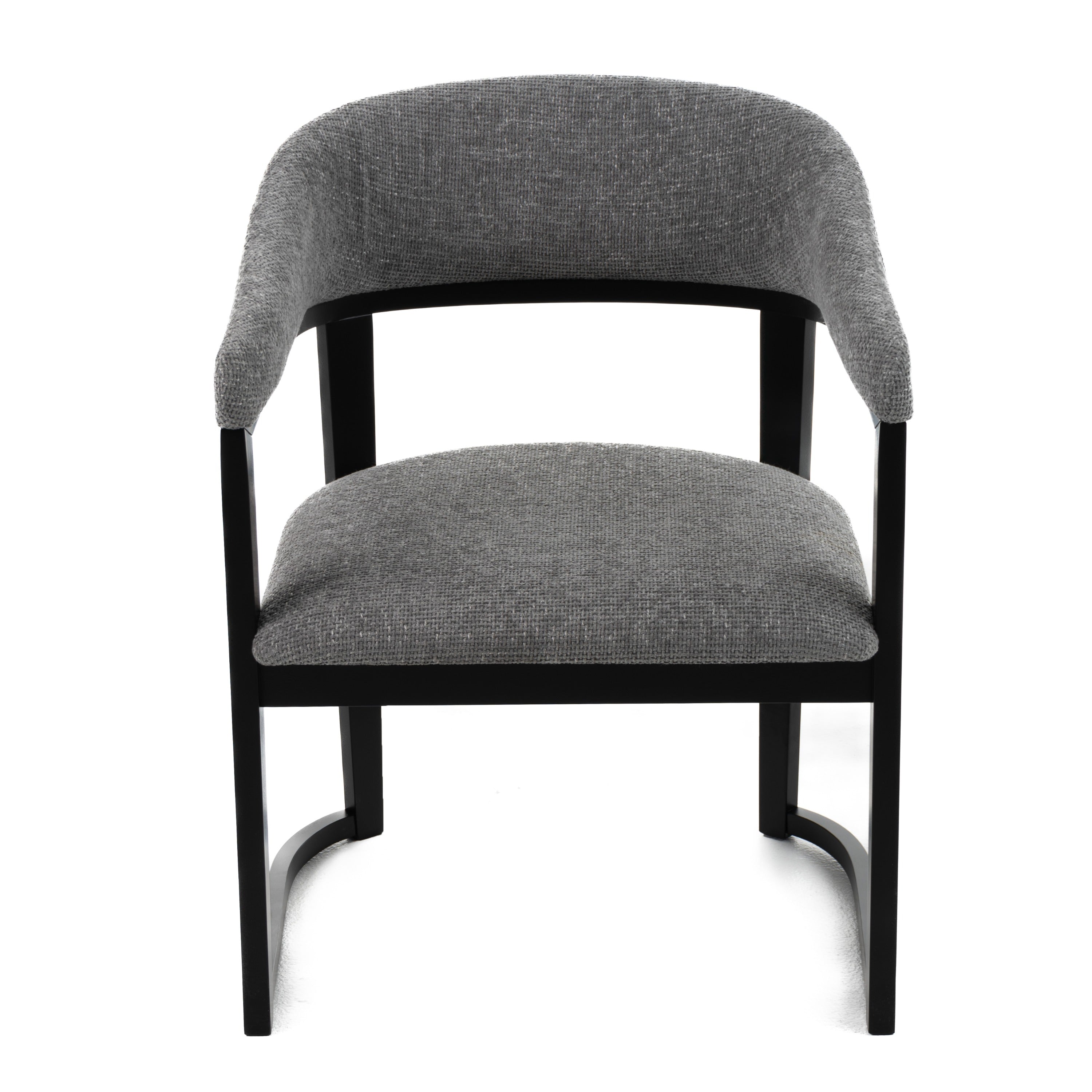 The Modrest Maury Modern Grey Fabric & Black Dining Chair features a contemporary design with a sleek and sophisticated look. The chair is upholstered in 100% polyester fabric, which comes in a stylish grey color. The upholstery is complemented by a solid rubberwood frame, finished in a rich black color. The chair is designed for comfort with a foam-filled seat and a solid back, making it a perfect addition to any modern dining room. Fully assembled, this dining armchair combines both functionality and elegance, offering a durable and chic seating option.