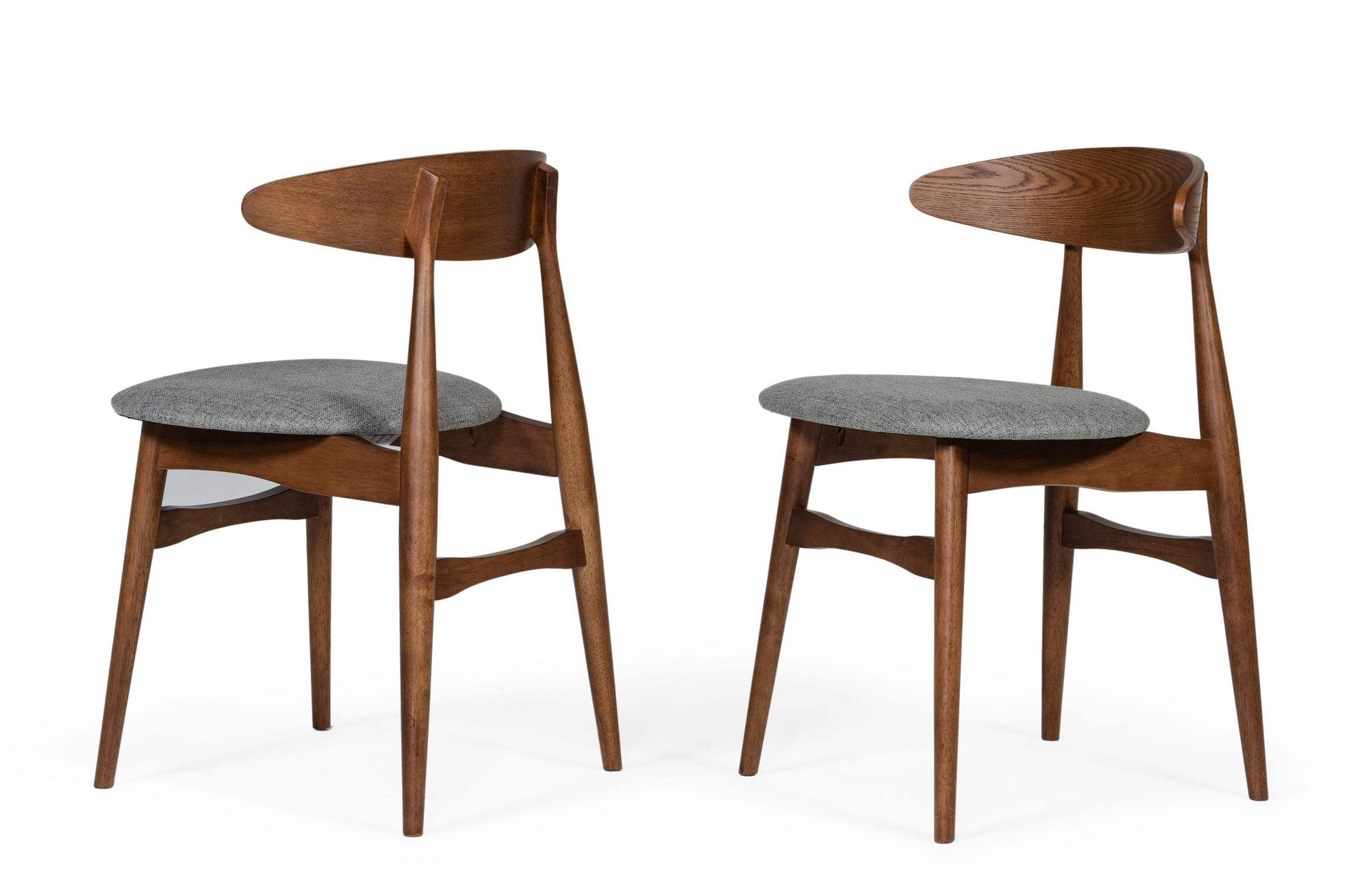 The Prospect Dining chair is a solid wood chair with a walnut finish. The oval-shaped back and tapered legs create a classic mid-century style silhouette. The seat is upholstered in a grey textured fabric that creates warmth in a contemporary space. The deep walnut finish pairs very well with a rustic or industrial style.