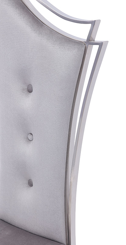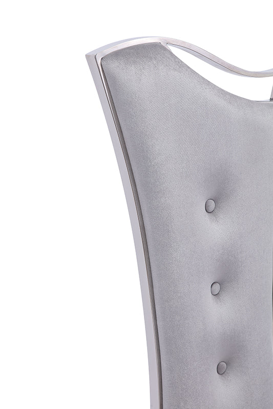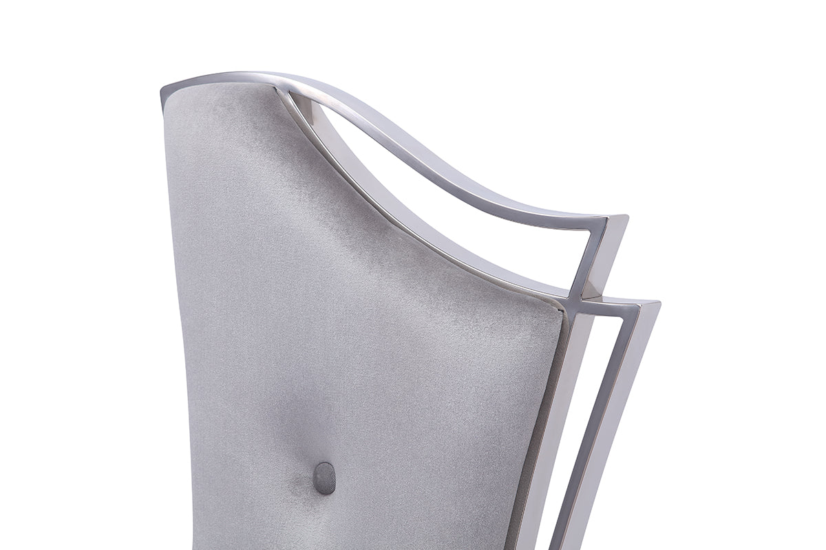 Exquisitely designed is the Modrest Bonnie Modern Grey Velvet & Stainless-Steel Dining Chair. Constructed in a sleek polished stainless-steel frame with grey velvet fabric upholstery, it features linear button tufts in the middle of the front back. Exuding glam and poise, this chair features an asymmetrical back design with 2-lined steel bars on the right front side. Providing support with crossed back legs and the tri-shaped and bowed front legs that are all fitted with leg stoppers. Give your home a luxurious look with this modern velvet & stainless-steel dining chair that comes fully assembled and available is in a set of two.