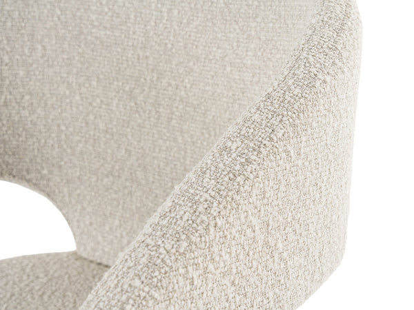 The Claudine Dining Chair is a beautiful modern piece of furniture. The sloped arms match height perfectly with the low back of the chair, creating a stylish silhouette. Upholstered in a soft off-white boucle fabric, this chair is comfortable and stylish. The antique brass finished legs have modern lines and contrast the soft fabric. The Claudine chairs can be paired with any style and look right at home.