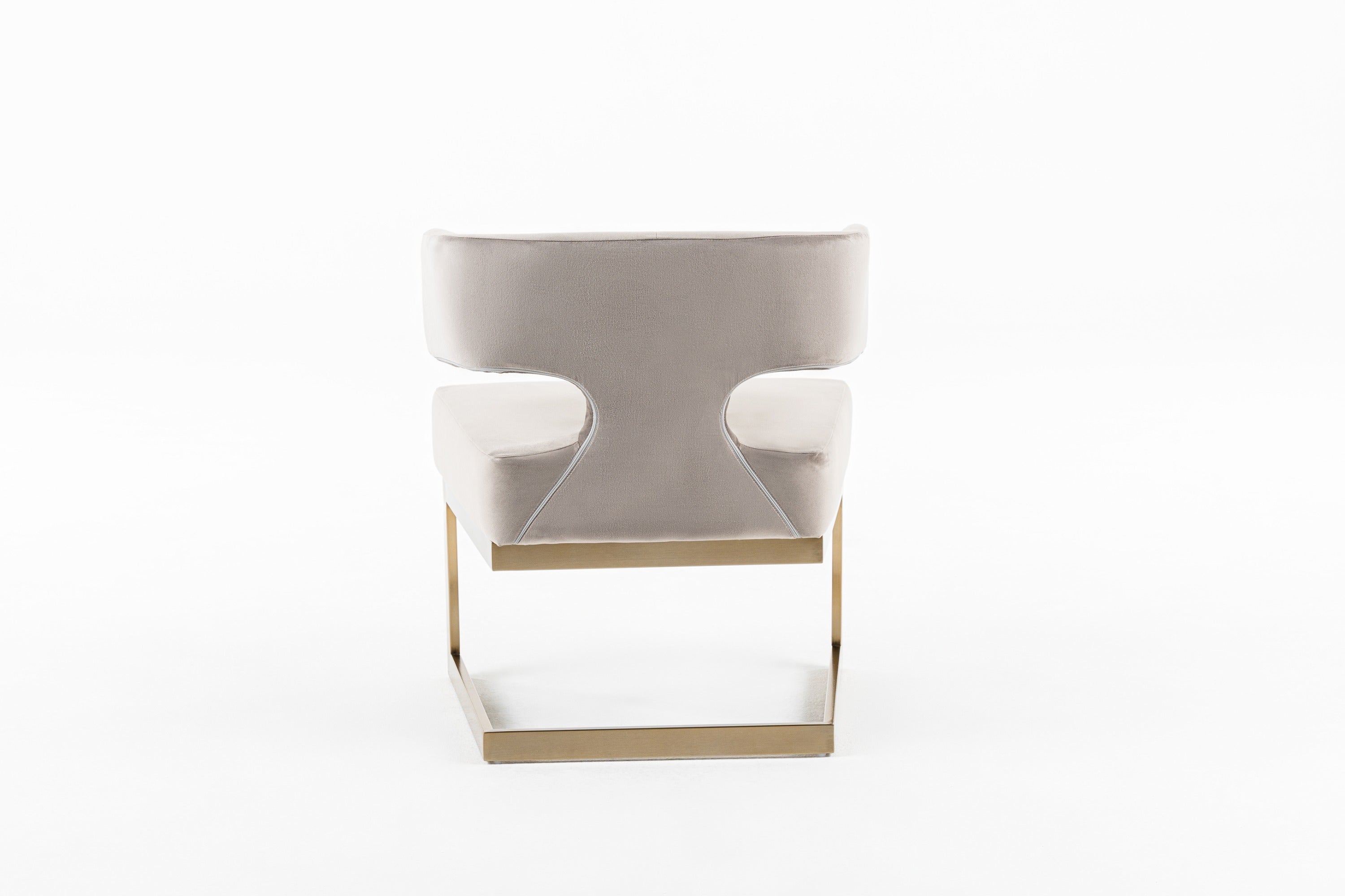 Ready to capture anyone's heart is the dashing Modrest Calvo Modern Off-White Velvet & Brass Dining Chair. It features an open back and arms design that provides a light airy feel. The encircling arms structure offers security that kids and even grandpa and grandma can sit on it without you worrying about them falling off on the side of the chair. This brass stainless steel framed modern chair requires no assembly and is perfect for small spaces because of its generous proportion.