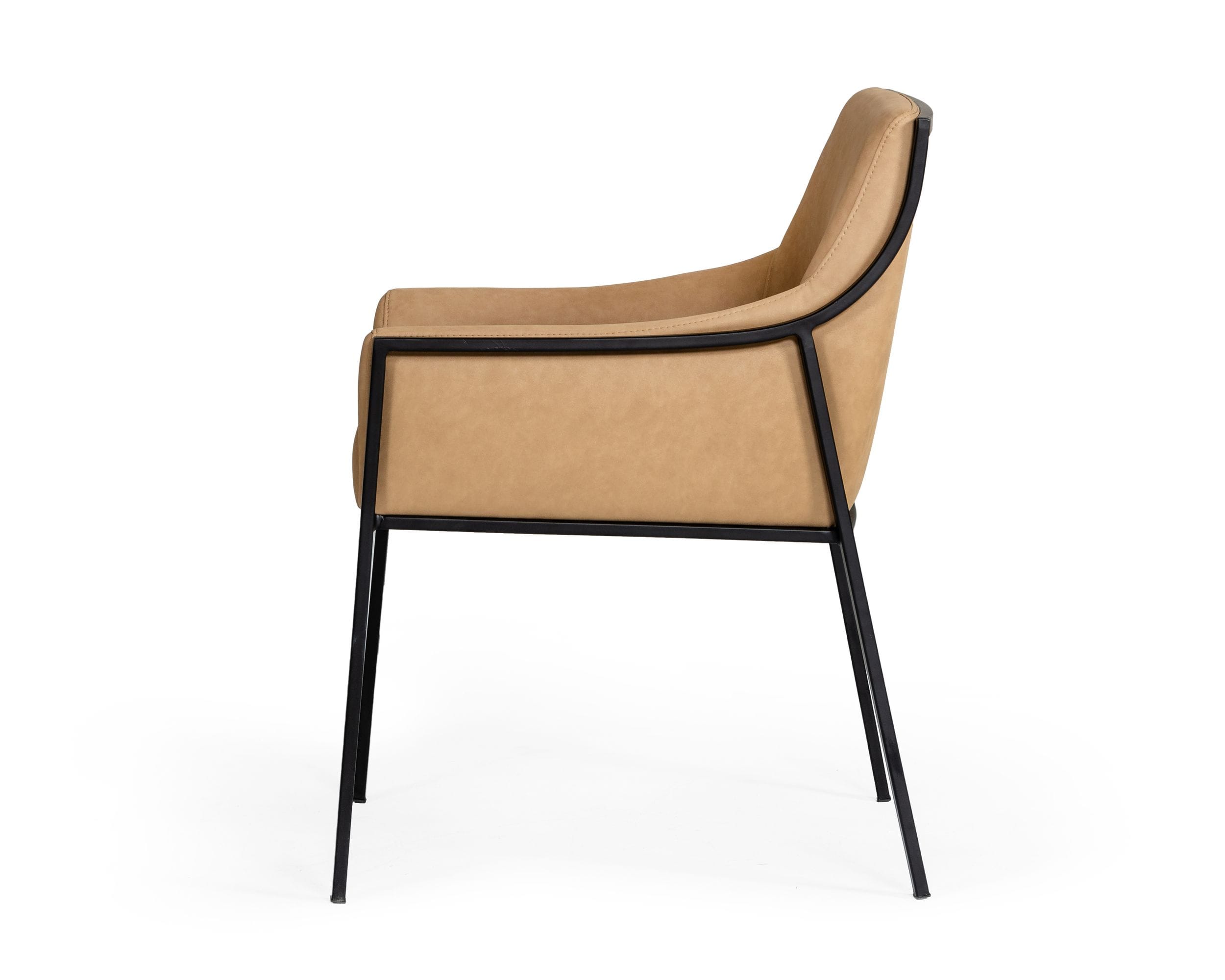 The exposed frame of the Raul Dining Chair is a dark contrast to light tan vegan leather base that creates visual stimulation and modern styling. The perfect match of soft upholstery with cold metal, this becomes a staple for modern design.