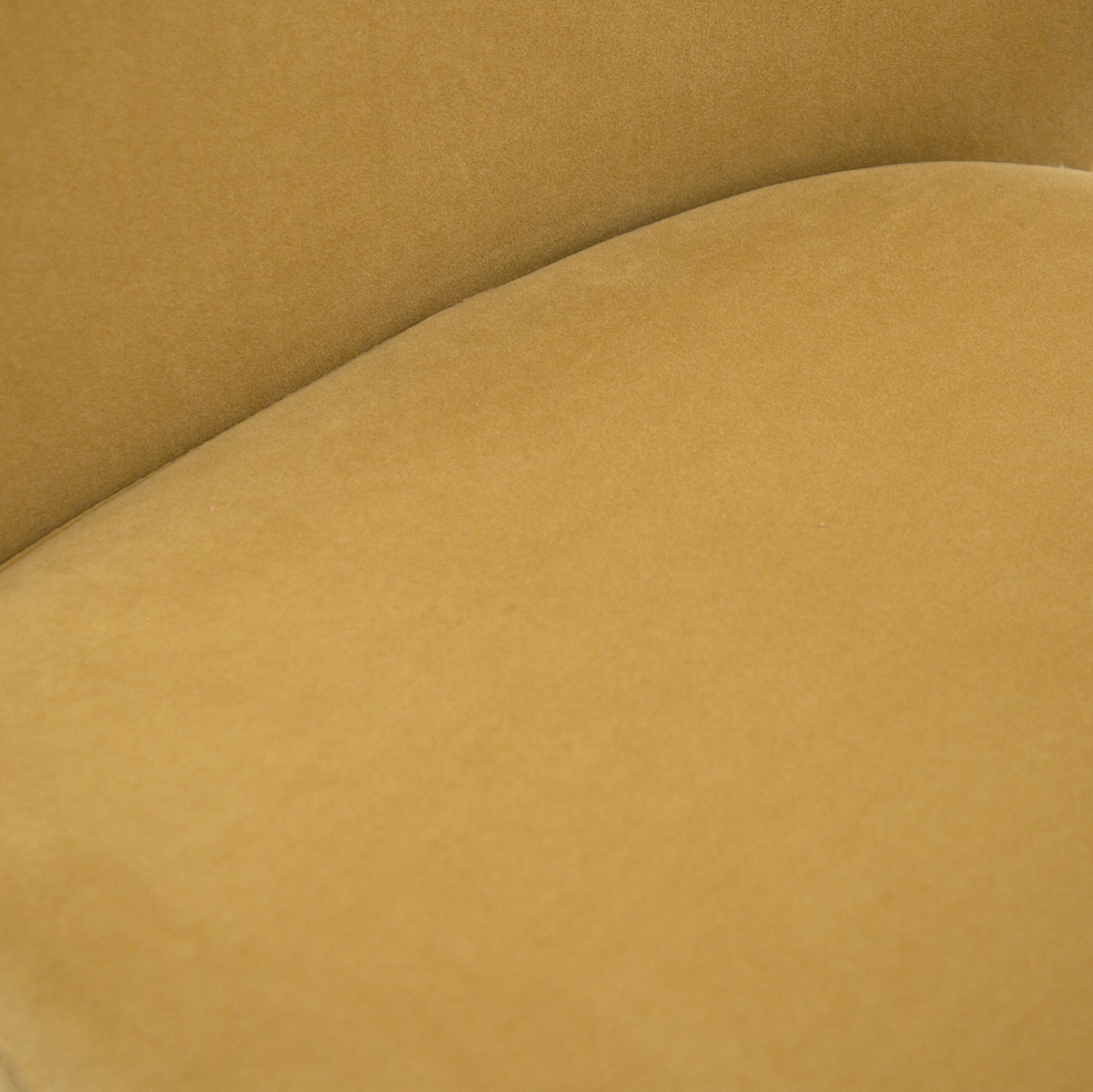 The Brea Dining chair features characteristics of Art Deco design with a modern twist, from its wraparound silhouette to its tan Jade cushions. A cut-out back gives the appearance of a floating seat, giving the chair a whimsical and lavishly modern appearance.