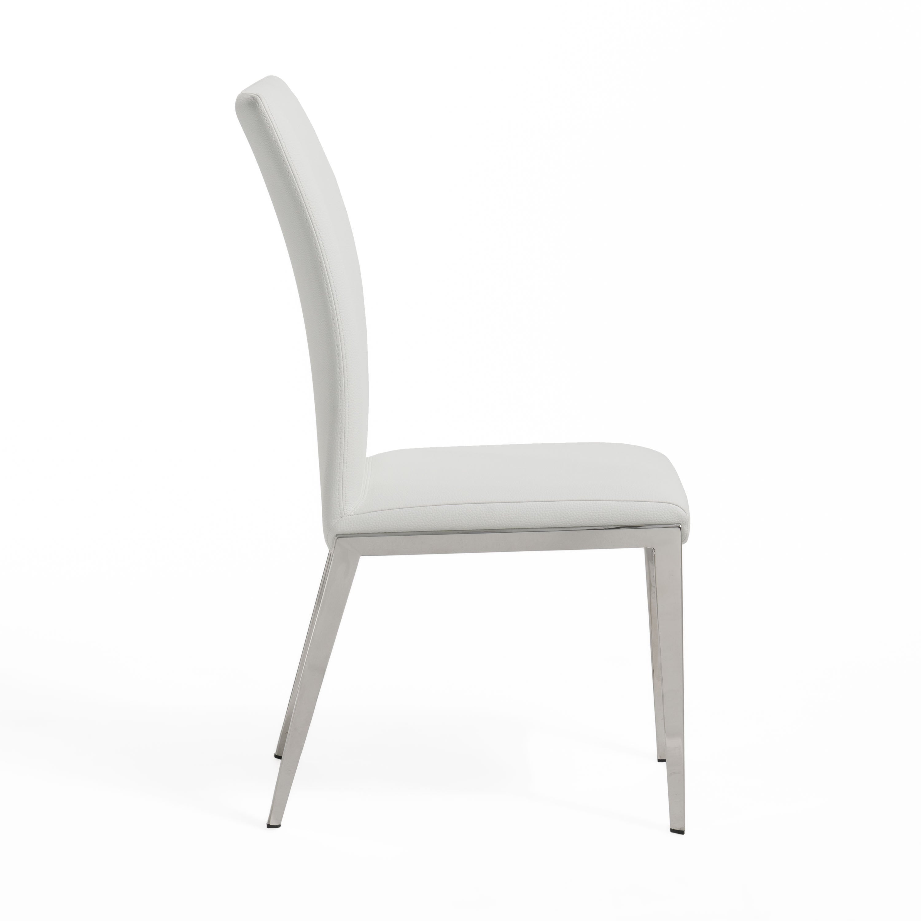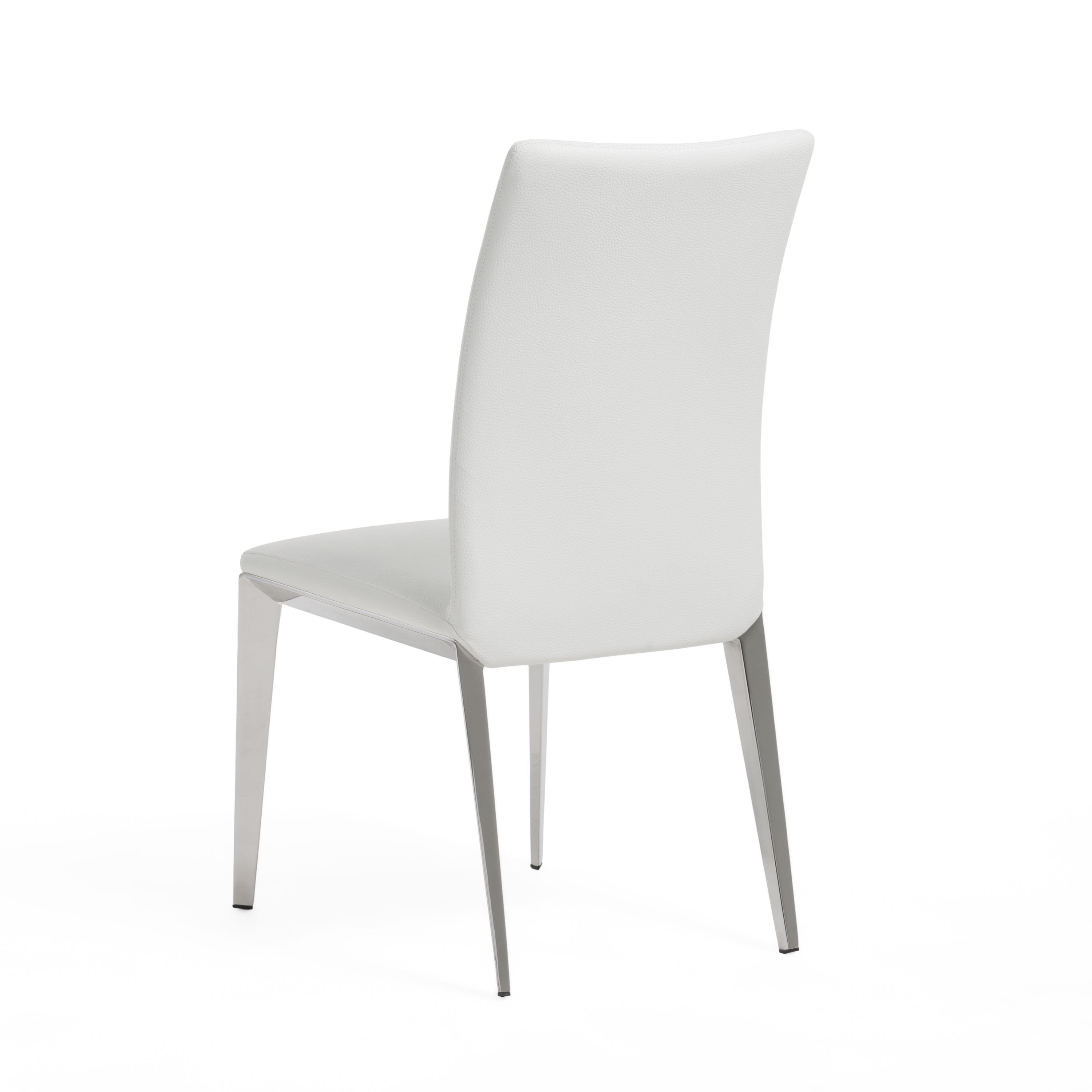 This set of 2 Taryn - Modern White Dining Chair features a dainty triangular stainless steel frame upholstered in dainty white leatherette. This modern dining chair with medium-height back features curved corners and back edge. Rubber stoppers on legs prevent damage on your floor.
