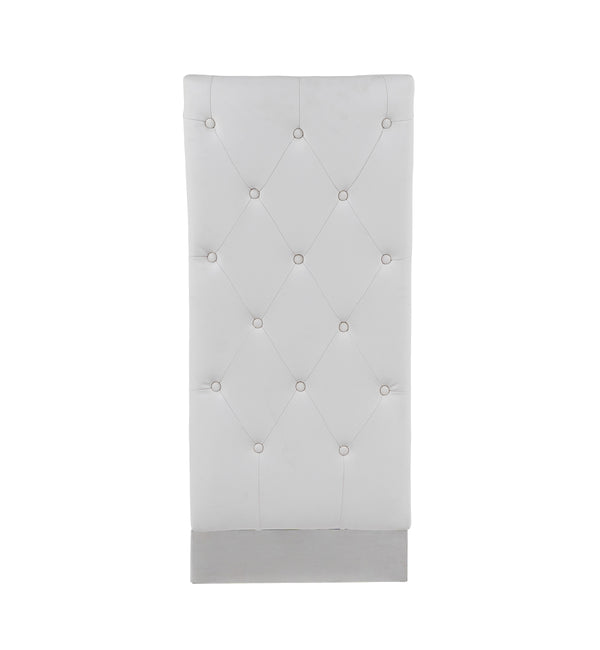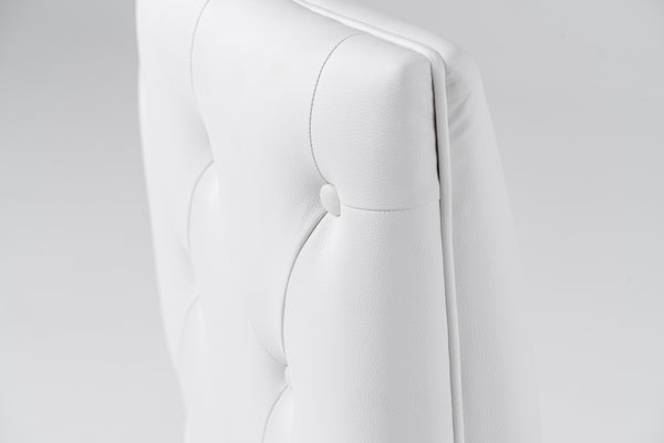 Get that chic and posh dining room with the Modrest Kilson Modern White Leatherette & Stainless Steel Dining Chair. Available in a set of 2, this pair features a foamed full seat and a floor-length back that sits on a metal base. Adding to its alluring looks are button tufts that adorn the rear side of the backrest. Dainty white leatherette upholstery covers the seat and backrest. Robust polished stainless steel base and tapered front legs provide steady support. The modern dining chair lends a retro feel to your modern home.