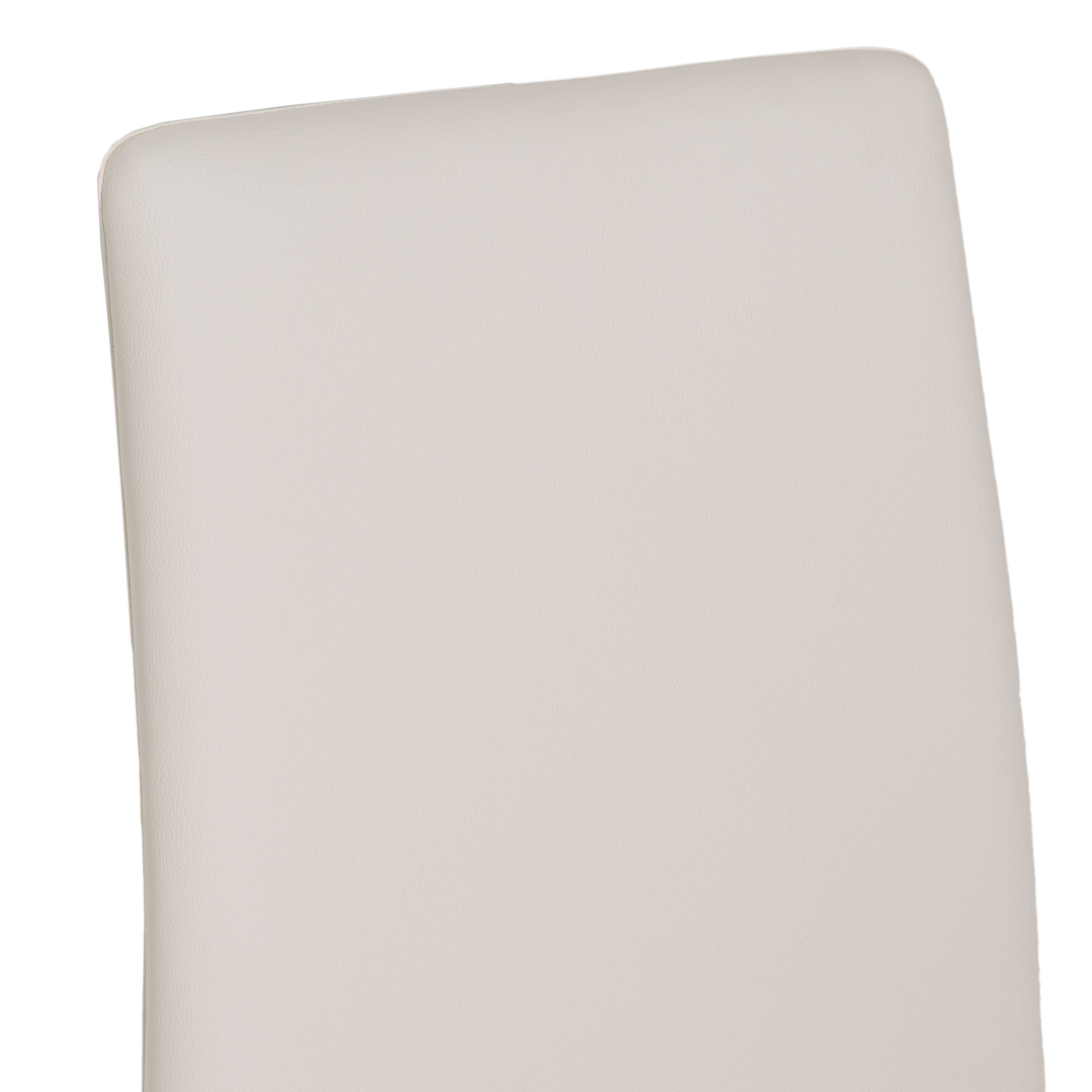 The Nisse dining chair features a wide base construction which offers extra stability for the streamline design.  Upholstered in white leatherette and accented with stainless steel legs. Also available in black and grey.