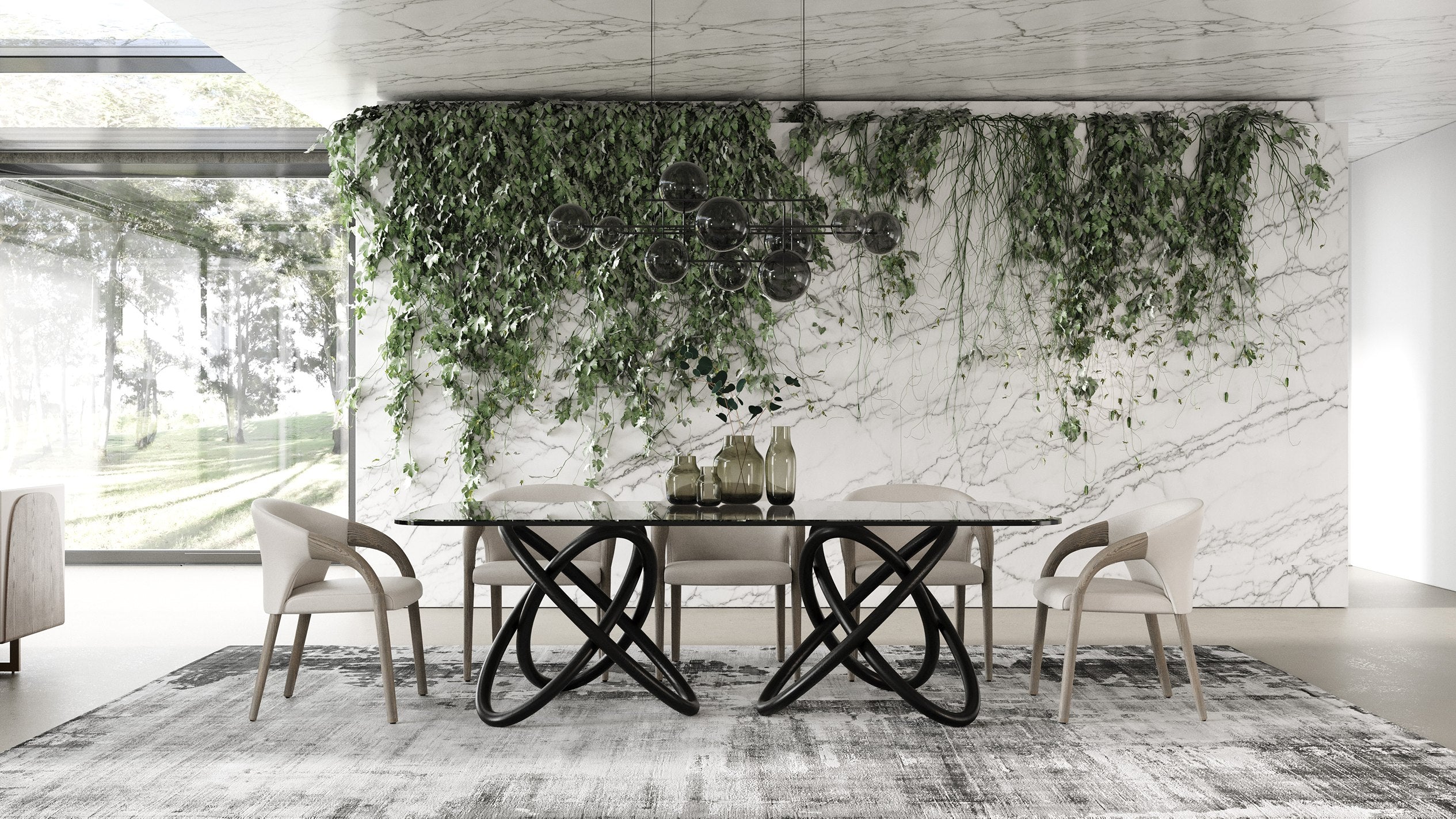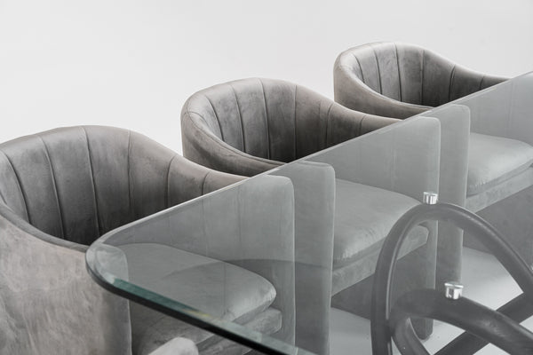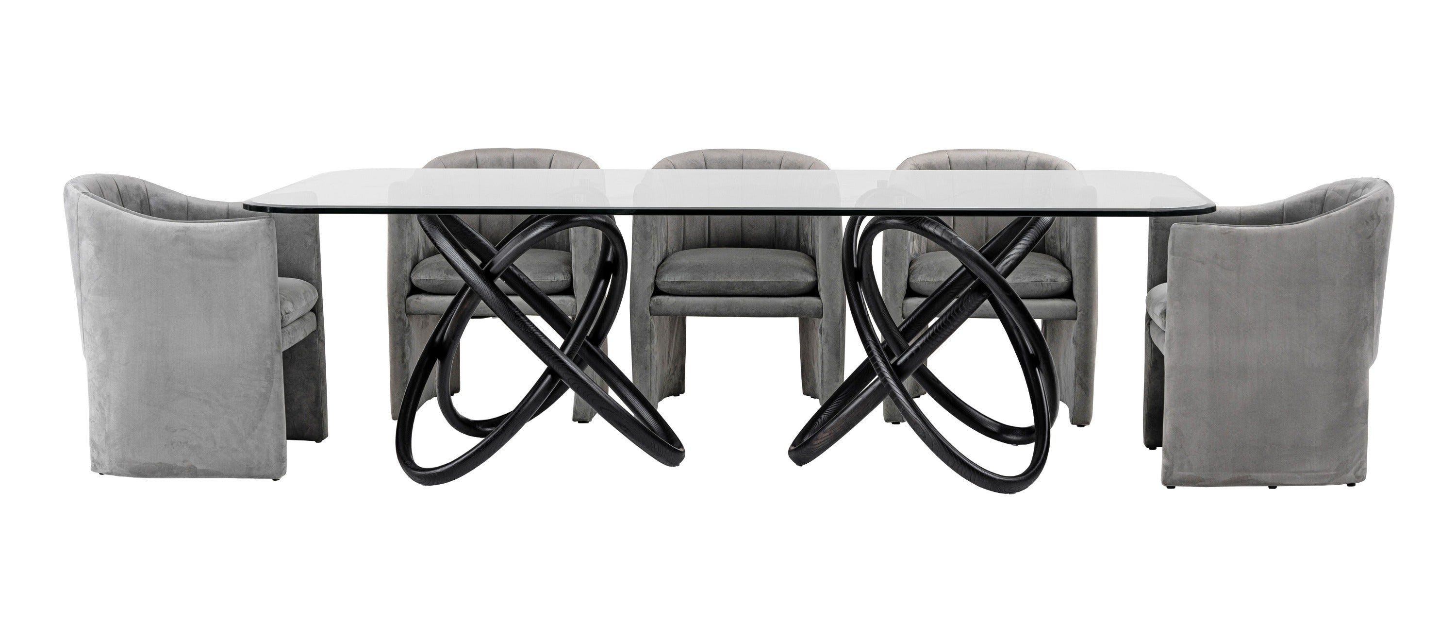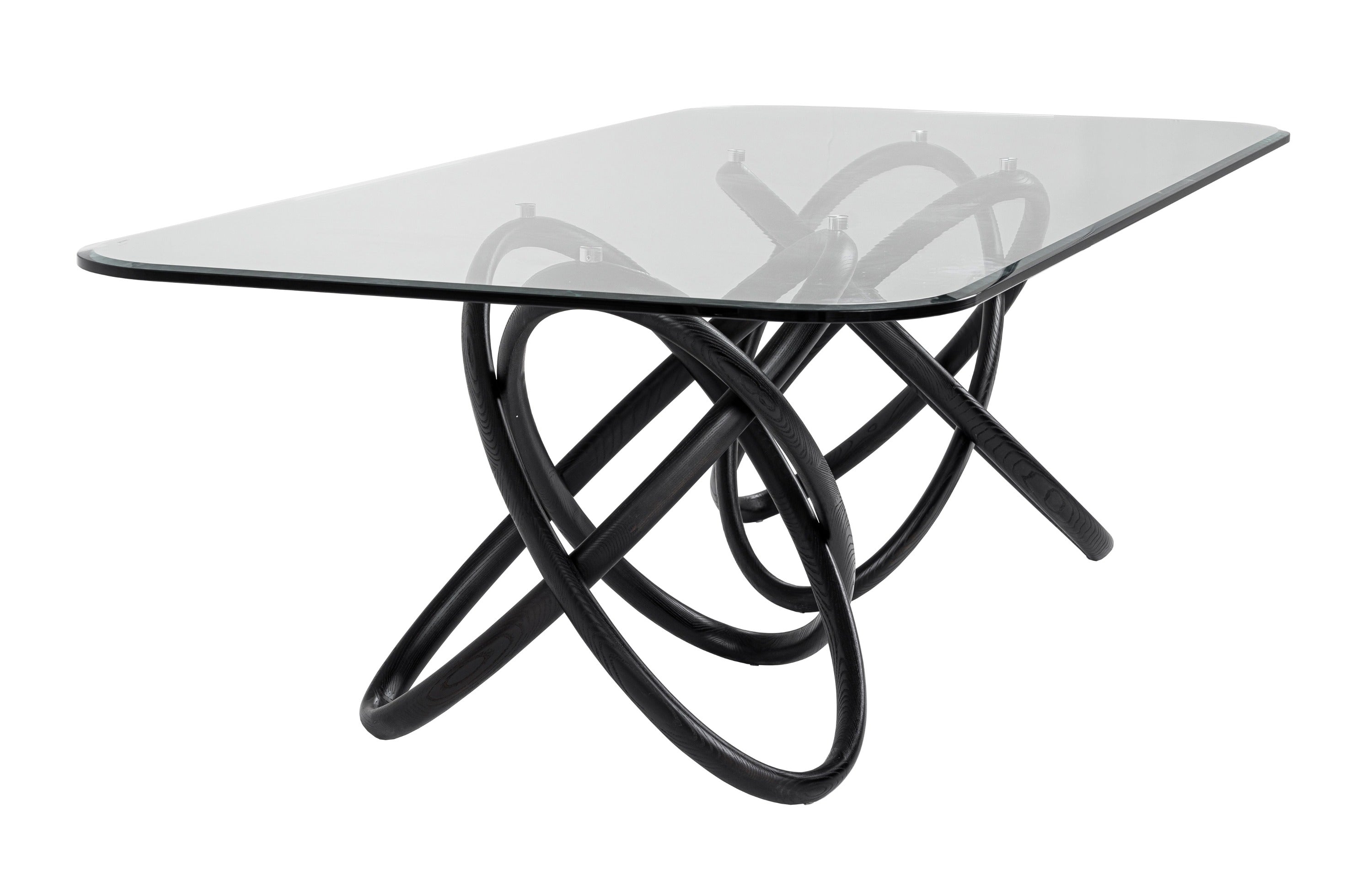 The Modrest Mason Modern Glass & Black Ash Dining Table exudes ingenuity featuring an intersecting spherical black finished solid ash wood base that reminds of a modern art display. A clear glass top sits along the top as if floating. This Zen table is sure to shine in a modern, contemporary, or mid-century style home. Pair with any of our Mid-Century dining chairs for a perfect match.