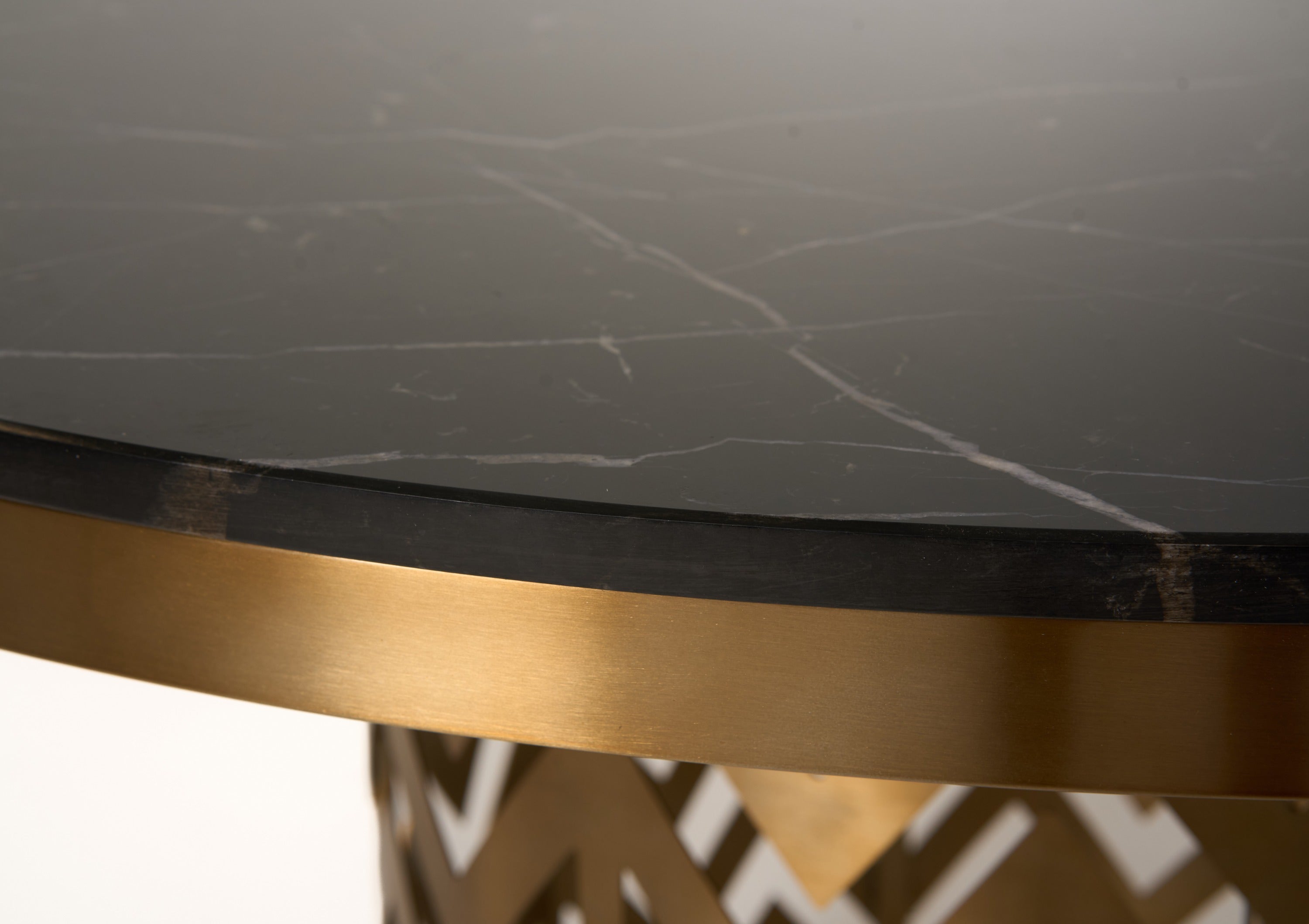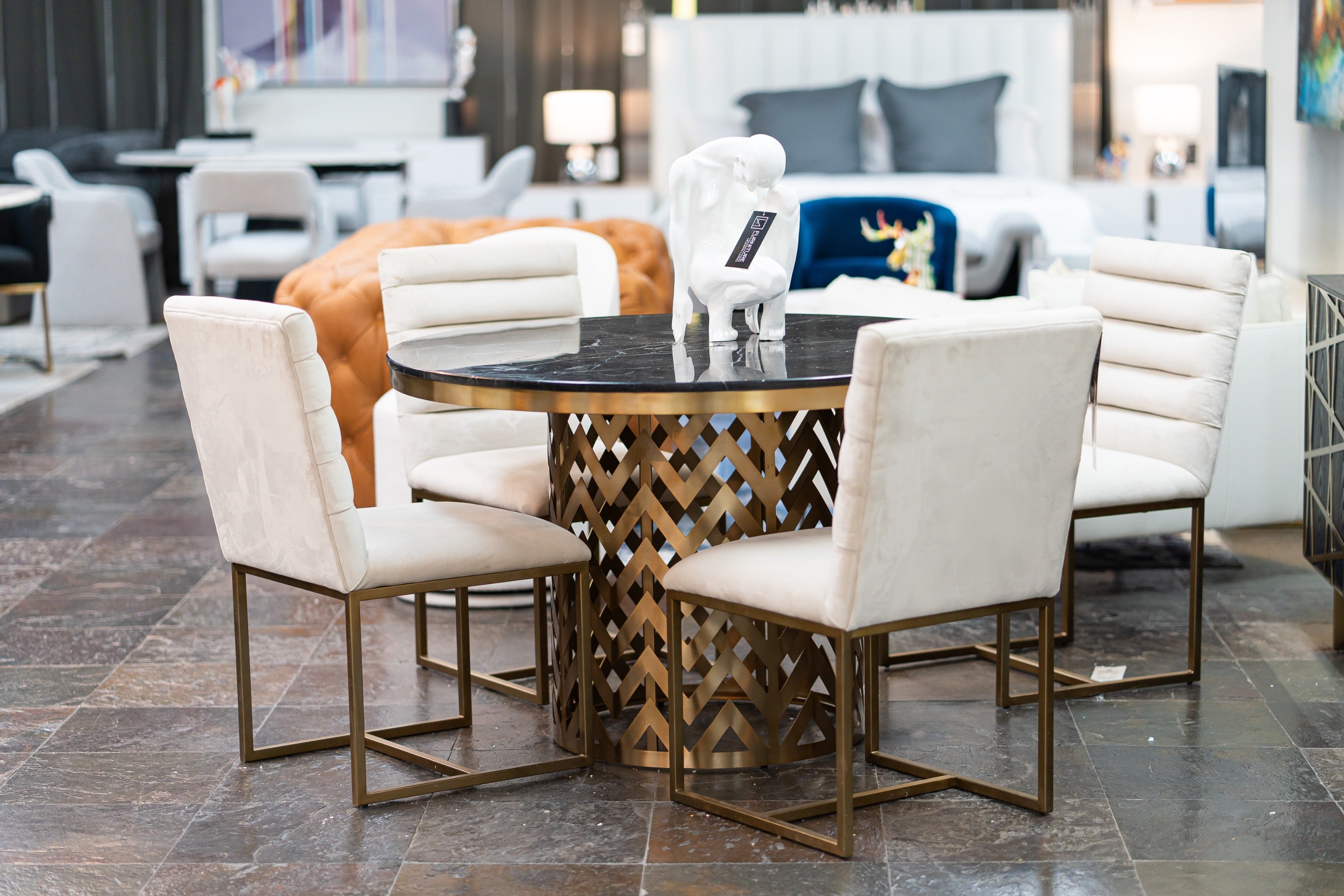 The Kowal Round Dining Table is a great addition to any contemporary home. The gold stainless steel legs add charisma while the geometric base creates a texture and movement. This modern masterpiece is sure to anchor your guests firmly in the dining area.