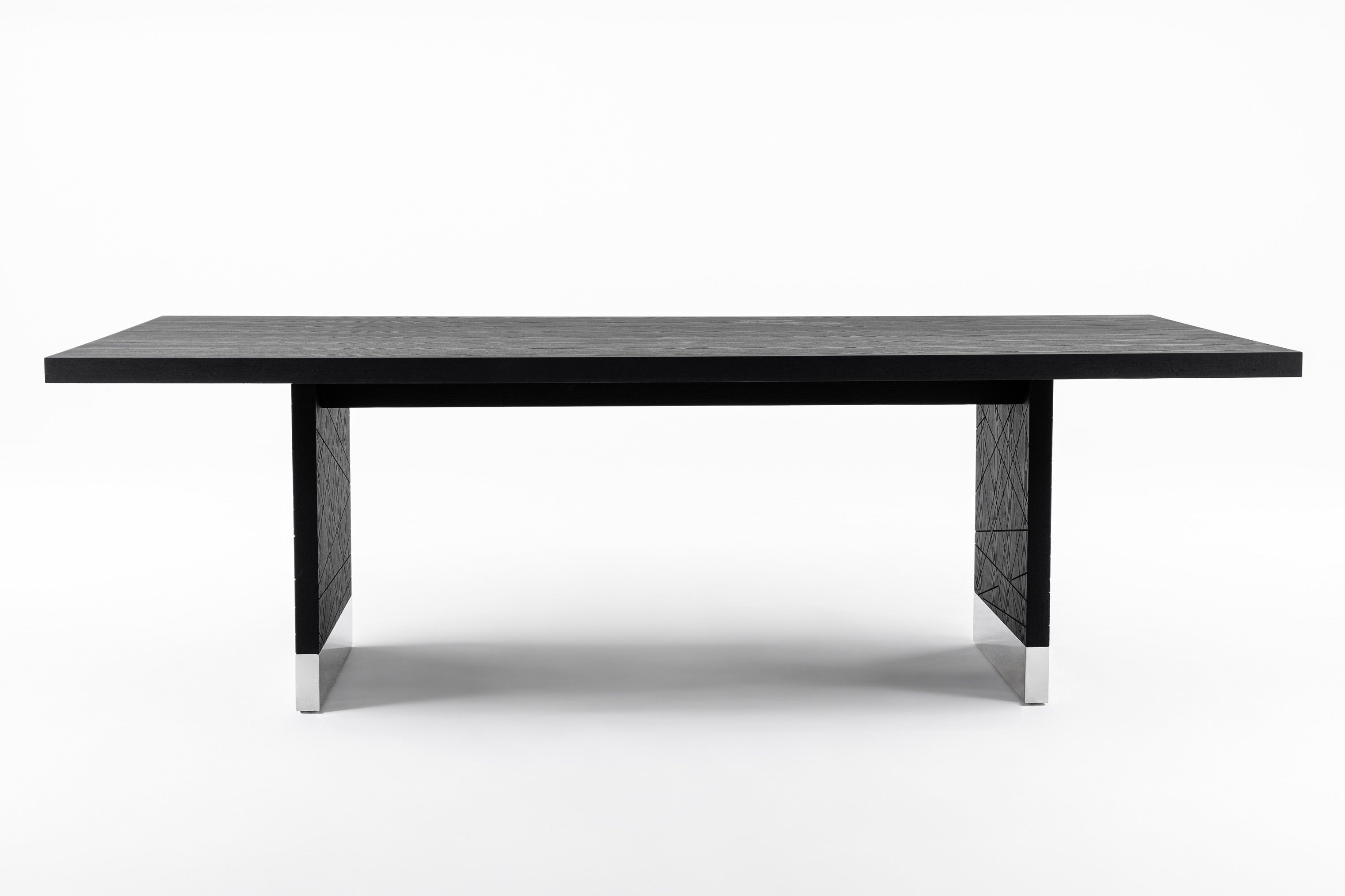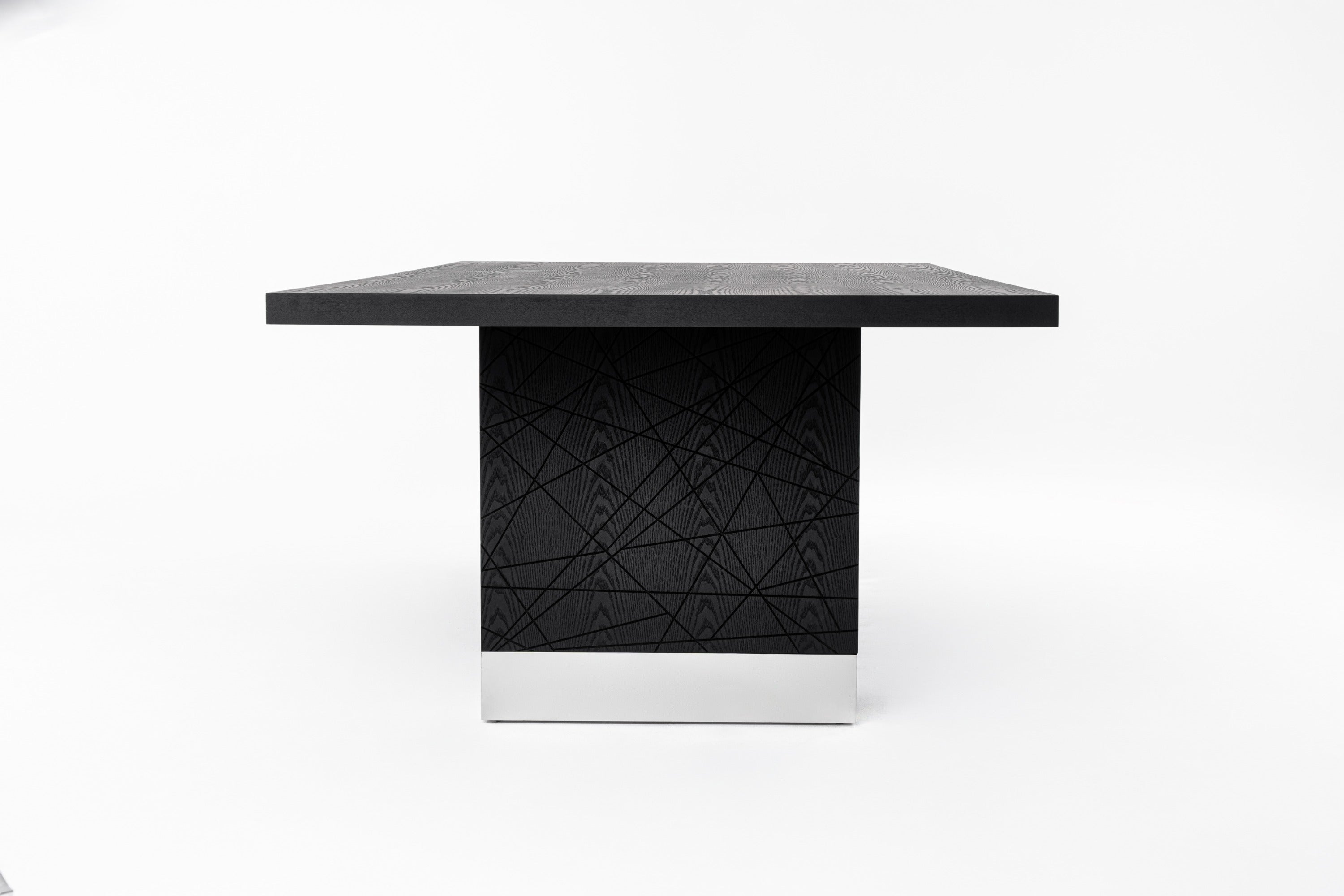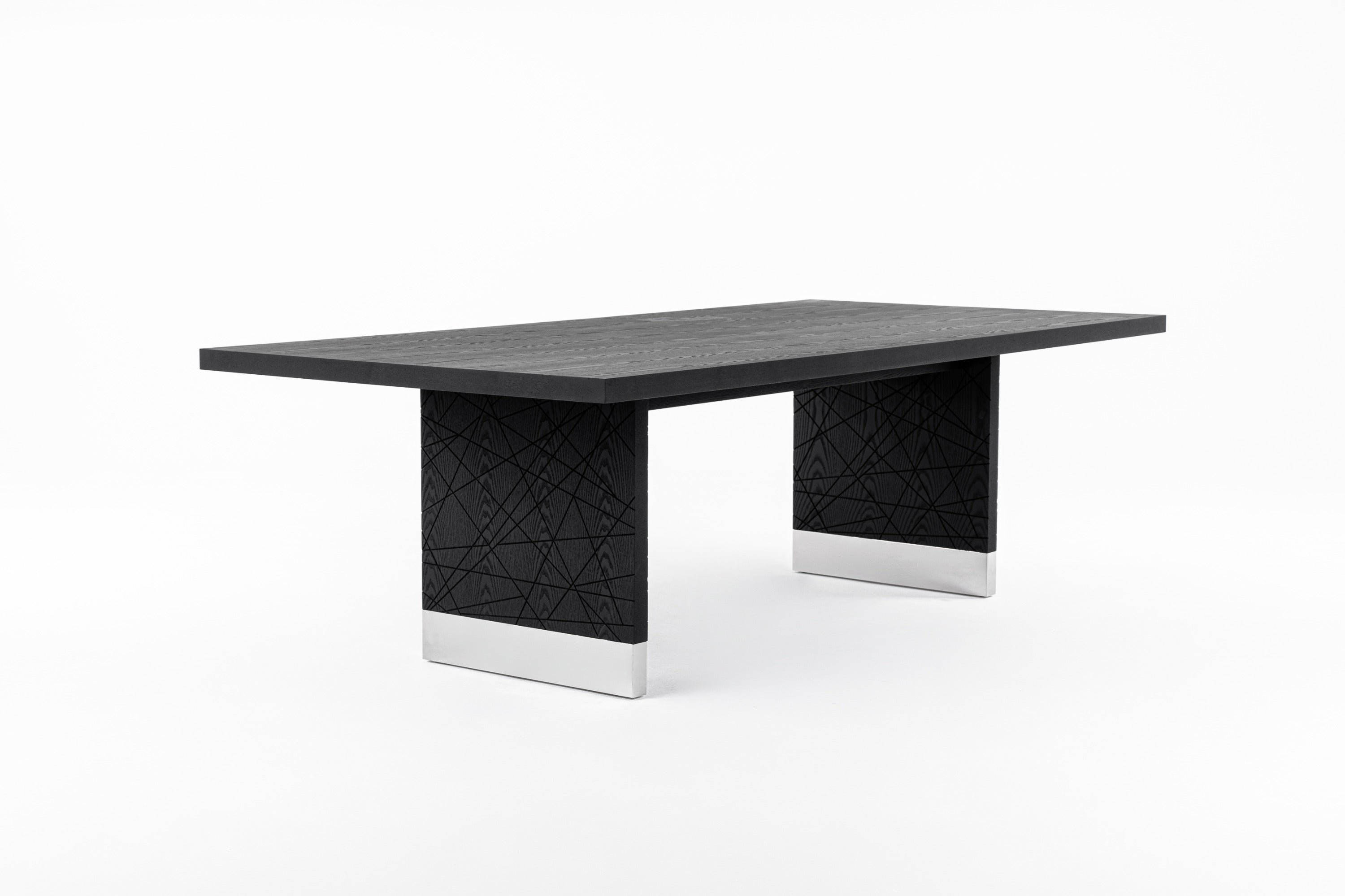 The Modrest Kenda Modern Dining Table seamlessly blends form and function. Crafted with precision, this rectangular dining table features a sleek black ash veneer finish that exudes sophistication. The stainless steel accent adds a touch of contemporary elegance. With ample space to accommodate up to 8 guests, its double pedestal base ensures stability and style for memorable dining experiences.