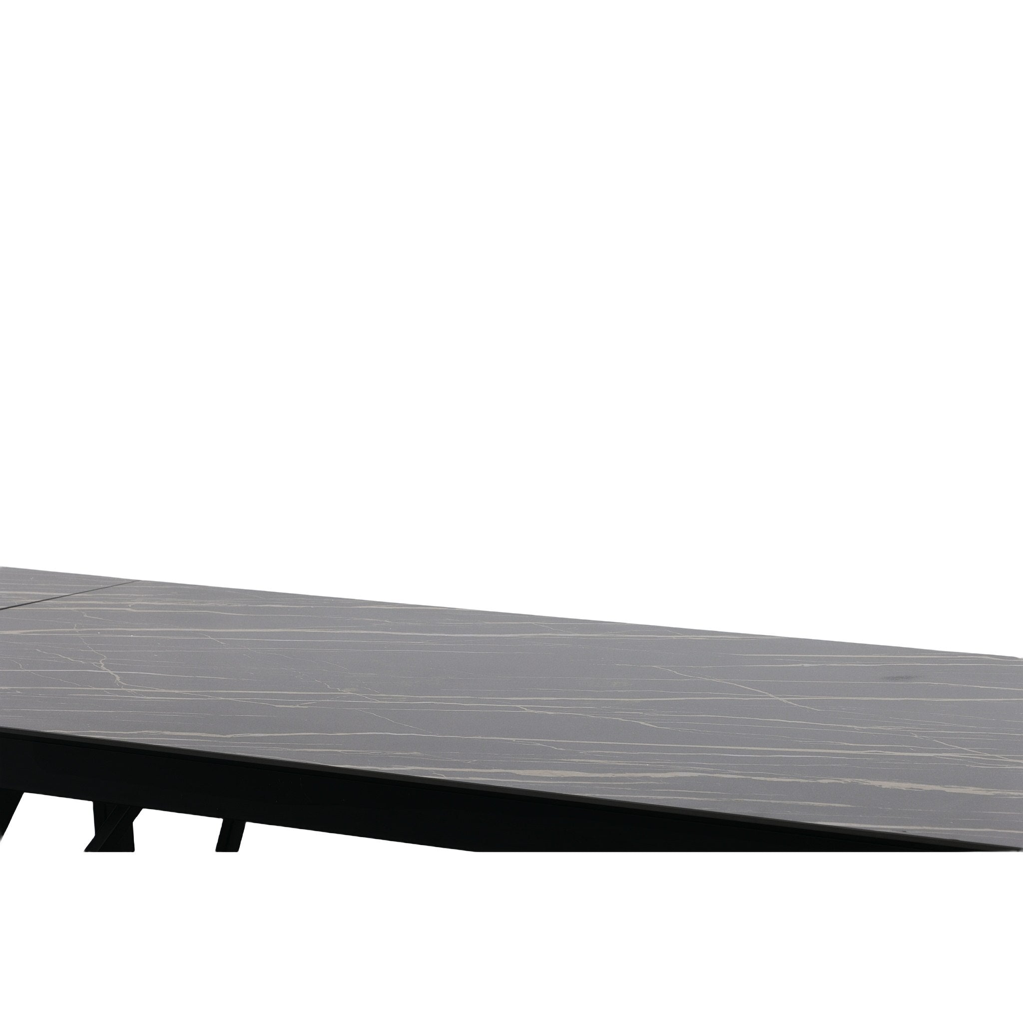 The Bobby Extendable Dining Table features the Marble looking Black Ceramic Top, easy to clean, durable and attractive. The Modern Black Iron Base is sturdy and supportive. Seats 6 to 8 people comfortably.