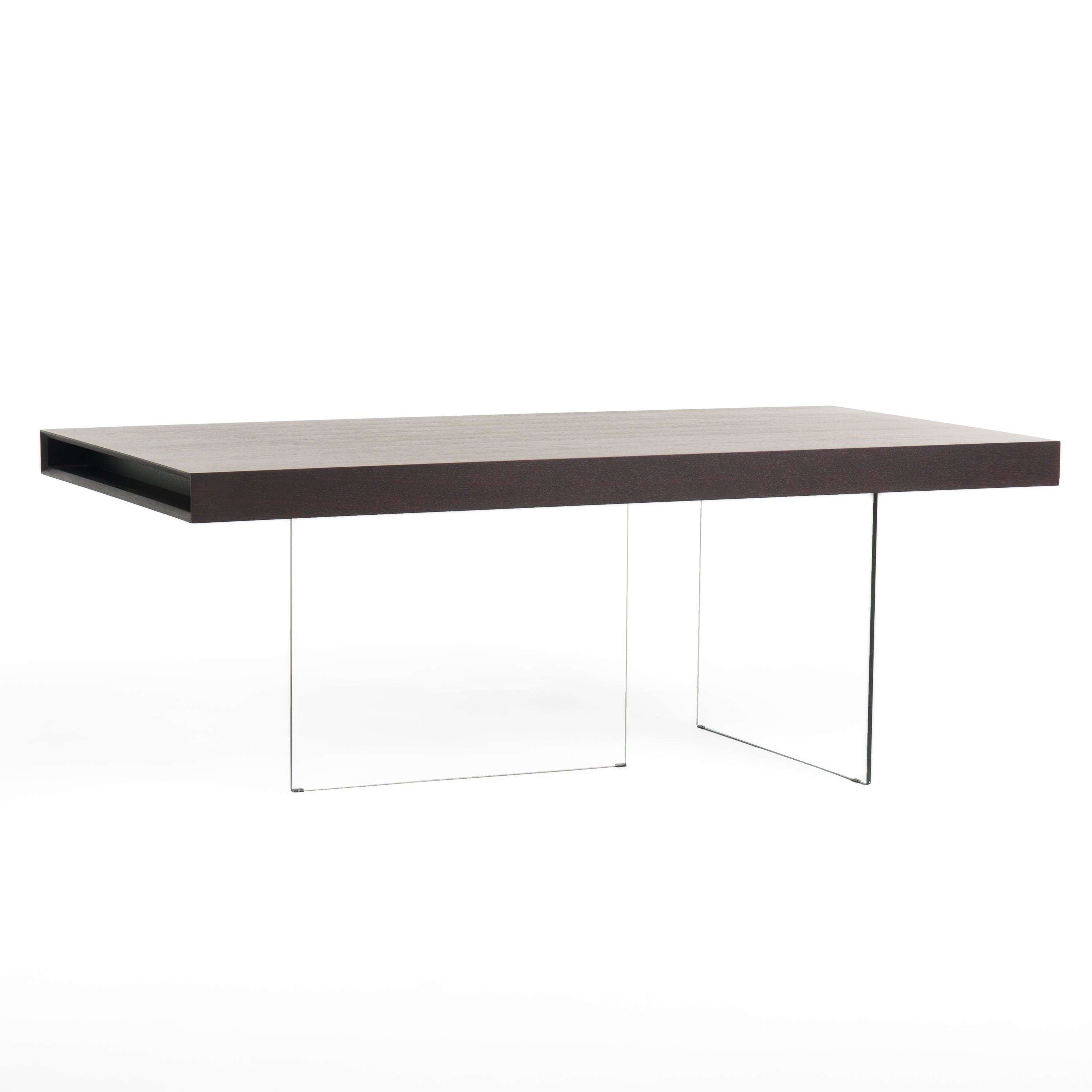 Bestowing your dining room subtle sophistication is the Modrest Encino Modern Chocolate & Glass Dining Table. Constructed with a rectangular Chocolate Veneer finish table top, it uses clear tempered glass for its legs that added to its allure. With floor protectors, the legs position makes a stunning sight, as one was placed in the center while the other was on the right facing side. This shows artistic imagination and creates a floating impression. Seating 6-8 comfortably, this remarkably designed modern dining table creates a beautiful modern statement to your home.