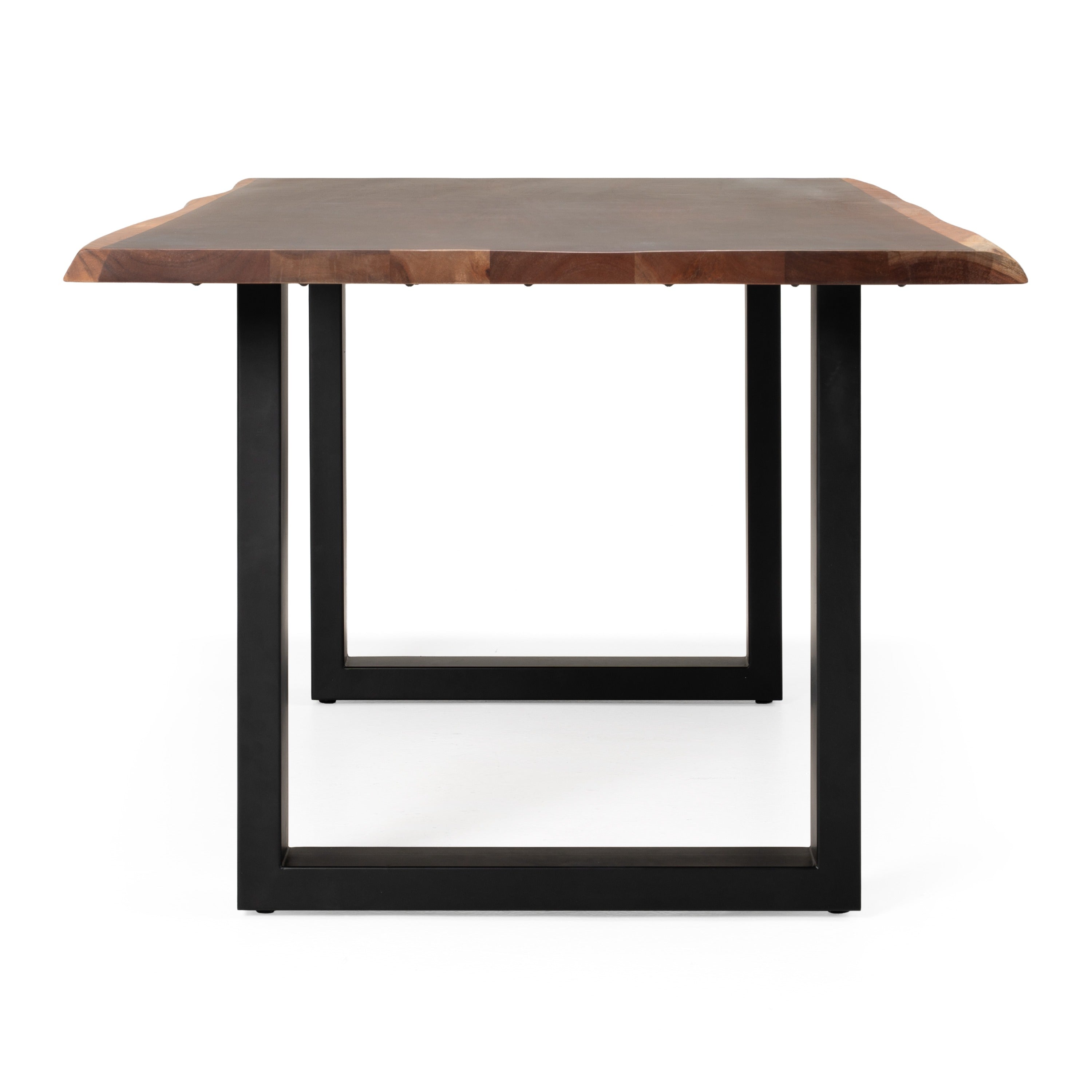 Natural wood is the earmark of the Modrest Taylor Modern Live Edge Wood Dining Table that can seat 6 comfortably. Constructed of solid Acacia wood, it has a rectangular 1 1/2-inch table top with a rustic and clean finish. The character and hue of the wood grains on the clean finish and the weathered edges made it even more enticing and interesting. Placed atop U-shaped black metal legs, this dining table has a minimal impact on the environment as wood forests are renewable.