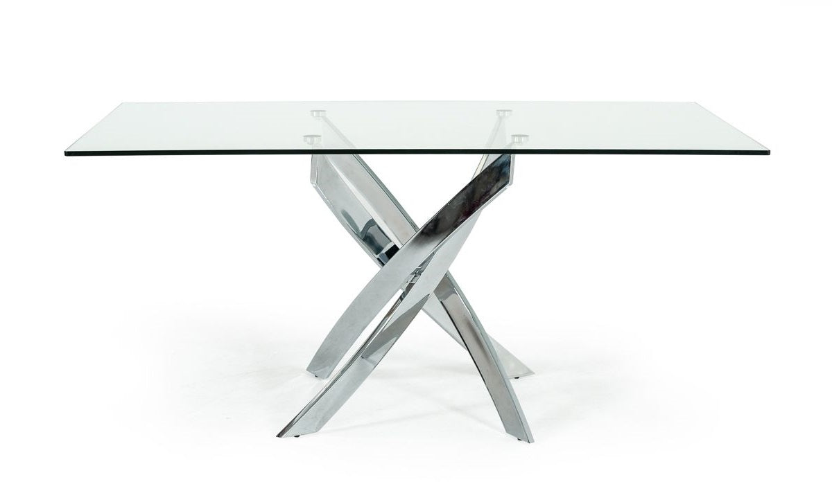 Rectangular clear tempered glass is held up by entwining chrome legs to create a poised composition. Table comfortably fits six people. Also available as a round table.